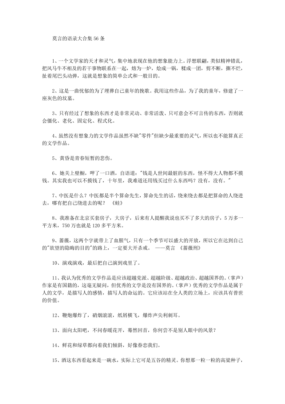 莫言的语录大合集 56 条 1、一个文学家的天才和灵气,集中地表现在他的想象能力上浮想联翩,类似精神错乱,把风马牛不相及的若干事物联系在一起,熔为一炉,烩成一锅,糅成一团,剪不断,撕不烂,扯着尾巴头动弹,这就是想象的简单公式和一般目的2、这是一曲忧郁的为了埋葬自己童年的挽歌我用这些作品,为了我的童年,修建了一座灰色的坟墓3、只有经过了想象的东西才是非常灵动、非常活泼、只可意会不可言传的东西,否则就会僵化、老化、固定化、程式化4、虽然没有想象力的文学作品虽然不缺零件但缺少最重要的灵气,所以也不能算真正的文学作品5、黄昏是青春短暂的悲伤6、她关上壁橱,呷了一口酒,自语道:钱是人世间最脏的东西,怪不得大人物都不摸钱其实我也可以不摸钱了,十年里,我难道还用钱买过什么东西吗?没有,没有7、中医是什么?中医都是半个算命先生,算命先生的话,绕来绕去都是把算命的人绕进去,哪有把自己绕进去的呢?蛙 8、我准备在北京买套房子,大房子,后来有人提醒我说也买不了多大的房子,5 万多一平方米,750 万也就是 120 多平方米9、蔷薇,这两个字就带上了血腥气,只有一个季节可以盛大的开放,所以它在达到自己的欲望的隐晦的目的的路上,一定要大开杀戒。