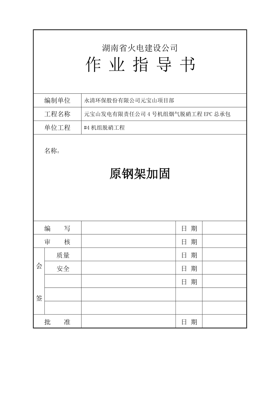 湖南省火电建设公司作 业 指 导 书编制单位永清环保股份有限公司元宝山项目部工程名称元宝山发电有限责任公司4号机组烟气脱硝工程EPC总承包单位工程#4机组脱硝工程名称: 原钢架加固编 写日 期审 核日 期会签质量日 期安全日 期日 期批 准日 期重要工序过程监控表序号重要工序名称执行情况质检工程师签名1234作业指导书(技术措施)修改意见征集表建 议 人日 期修改建议:回收签名(日期):目 录1 编制依据及引用标准 12 工程概况及施工范围 12.1工程概况 12.2施工范围 13 施工作业人员配备及人员资格要求 14 施工所需机械装备及工器具量具、安全防护用品配备 24.1施工所需机械装备及工器具量具 24.2安全防护用品配备 25 施工条件及施工前准备工作 26 作业程序、方法及要求 36.1作业程序流程图 36.2作业方法及要求 37 质量控制及质量验收 57.1质量控制标准 57.2中间控制见证点设置 5无 57.3工艺纪律及质量保证措施 58 安全、文明施工及环境管理要求和措施 5表8-1职业健康安全风险控制计划表(RCP) 7表8-2环境因素及控制措施一览表 99 强制性条文 101 编制依据及引用标准1.1元宝山4号600MW机组烟气脱硝工程EPC总承包《施工组织设计》1.2《电力建设施工及验收技术规范》(锅炉机组篇 DL5190.2-2012)1.3《钢结构工程施工质量验收规范》GB50205-20011.4《电力建设安全工作规程》(火力发电厂部分)DL5009·1-2002 1.5《电力建设施工质量验收及评价规程》(第2部分:锅炉机组)DL/T5210.2-20091.6《钢结构设计说明书》(永清环保股份有限公司)1.7 钢结构加固技术规范(CECS 77:96) 1.8钢结构工程施工质量验收规范(GB50205-2001)2 工程概况及施工范围2.1工程概况元宝山发电有限责任公司总装机容量为1800MW,一期工程投产的300MW机组,锅炉由瑞士苏尔寿公司生产,汽轮机、发电机由法国CEM公司引进,1978年末并网发电,目前已经拆除。