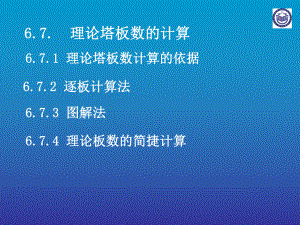 6.7.6.7.理论塔板数的计算理论塔板数的计算 6.7.2 6.7.2 逐板计算法逐板计算法6.7.3 6.7.3 图解法图解法6.7.1 6.7.1 理论塔板数计算的依据理论塔板数计算的依据 6.7.4 6.7.4 理理论板数的简捷计算论板数的简捷计算本节学习要点:本节学习要点:1 1、掌握逐板计算法和图解法求理论塔板数。、掌握逐板计算法和图解法求理论塔板数。2 2、使用逐板计算法和图解法求取理论塔板数,、使用逐板计算法和图解法求取理论塔板数,都要及时更换操作线方程。都要及时更换操作线方程。6.7.1 6.7.1 理论塔板数计算的依据理论塔板数计算的依据 F、xF、q、xD、xW、R、(、(D、W可计算可计算出来),这些参数是研究理论板的最重要的前出来),这些参数是研究理论板的最重要的前提条件;提条件;TPNN(5-615-61)式中:式中:NT理论板数;理论板数;全塔效率;全塔效率;NP实际塔板数;实际塔板数;根据:根据:1 1、平衡关系:、平衡关系:用某一温度下纯组分的饱和蒸汽压表示;用某一温度下纯组分的饱和蒸汽压表示;t-x-y图;图;x-y图;图;用相对挥发度表示;用相对挥发度表示;xxy)1(12 2、操作关系:、操作关系:提馏段提馏段操作关系:操作关系:精馏段精馏段操作关系:操作关系:111RxxRRyDnn1WmmWxLqFyxLqFWLqFW 双组分连续精馏塔所需理论板数,可采双组分连续精馏塔所需理论板数,可采用逐板计算法和图解法。用逐板计算法和图解法。6.7.2 6.7.2 逐板计算法逐板计算法 假设塔顶冷凝器为全凝器,泡点回流,塔假设塔顶冷凝器为全凝器,泡点回流,塔釜为间接蒸汽加热,进料为泡点进料如图釜为间接蒸汽加热,进料为泡点进料如图6 63535所示。所示。F,xFD,xDW,xWyWm-112nx1x2xnxm-1y2y1ym-1图图6 635 35 逐板计算法示意图逐板计算法示意图一、计算方法:一、计算方法:从塔顶或塔底一板一板算下去。从塔顶或塔底一板一板算下去。1 1、条件:、条件:1 1)F、xF、q、xD、xW、R、;2 2)塔顶全凝器不相当于一块塔板(没有分离;)塔顶全凝器不相当于一块塔板(没有分离;即进一个汽相出一个液相);塔底为相当于一块即进一个汽相出一个液相);塔底为相当于一块理论板的再沸器(进一个液相出一个液相和一个理论板的再沸器(进一个液相出一个液相和一个汽相);汽相);3 3)泡点进料()泡点进料(q=1,两操作线交点,两操作线交点xq=xF,用来,用来判别加料板位置。判别加料板位置。2 2、方法:、方法:从塔顶到塔底计算。从塔顶到塔底计算。精馏段精馏段:D1122xy nqxyxxx 平衡操作平衡 当当xn xq时,时,q为加料板,因为加料板,因q点为两点操点为两点操作线交点,加料板为提馏段一块板,所以精馏作线交点,加料板为提馏段一块板,所以精馏段理论板数为(段理论板数为(n-1)块板。)块板。提馏段:(改用提馏段操作线)提馏段:(改用提馏段操作线)(加料板下流液相组成)(加料板下流液相组成)1xxn122mWxyxxx 操作平衡提馏段:提馏段:m块板,提馏段内不包括再沸器,而块板,提馏段内不包括再沸器,而xW是再沸器内的浓度,所以是再沸器内的浓度,所以m块板中块板中包括再沸包括再沸器,器,再沸器相当一个理论板,所以塔内提馏段再沸器相当一个理论板,所以塔内提馏段为(为(m-1)块板。)块板。讨论讨论:1 1)逐板计算法很重要,用计算机编程计算很逐板计算法很重要,用计算机编程计算很快就计算出结果。快就计算出结果。2)以上理论板数是用泡点进料的情况所得,则)以上理论板数是用泡点进料的情况所得,则xq=xF,如果不是泡点进料,这时,如果不是泡点进料,这时xqxF,我们要,我们要把两条操作线交点把两条操作线交点q坐标求出,当坐标求出,当xxq,即为加,即为加料板。料板。3 3)塔顶采用分凝器:)塔顶采用分凝器:塔顶分凝器相当于第一块理论板(进一个塔顶分凝器相当于第一块理论板(进一个气相,出一个气相和一个液相);塔内第一块气相,出一个气相和一个液相);塔内第一块板就成为第二块板板就成为第二块板。D,xD L,xL V,y1 D,yD 图图6-36 分凝器流程图分凝器流程图 因为第一个分凝器实现了一次气液平衡,因为第一个分凝器实现了一次气液平衡,理论上相当于一块理论板(进一个气相,出一理论上相当于一块理论板(进一个气相,出一个气相和一个液相)个气相和一个液相)。4 4)塔底不相当于一块理论板;进入再沸器一个塔底不相当于一块理论板;进入再沸器一个液相,出一个气相,这在理论上没有实现气液相,出一个气相,这在理论上没有实现气-液液平衡,所以不相当于一块理论板。平衡,所以不相当于一块理论板。DDxyyD与与xL平衡:平衡:WWyxyW与与xW不平衡:不平衡:W,xW L V 图图6-37 塔底不平衡蒸发器流程图塔底不平衡蒸发器流程图xWyW6.7.3 6.7.3 图解法图解法 应用逐板计算法求精馏塔所需理论板数的应用逐板计算法求精馏塔所需理论板数的过程,可以在过程,可以在y-x图上用图解法进行。图上用图解法进行。一、具体求解步骤如下:一、具体求解步骤如下:在直角坐标系中绘出待分离的双组分物系在直角坐标系中绘出待分离的双组分物系y-x图,如图图,如图638。1 1、相平衡曲线:、相平衡曲线:1(1)xyx(6-10)图图6-38 理论板数图解法示意图理论板数图解法示意图ef加料过早加料过早2 2、精馏段操作线:、精馏段操作线:DnnxRxRRy1111(6-396-39)3 3、提馏段操作线:、提馏段操作线:1mmWL qFWyxxL qF WL qF W(6-596-59)从从a点开始,在精馏段操作线与平衡线之间点开始,在精馏段操作线与平衡线之间作水平线及垂直线,当梯级跨过作水平线及垂
