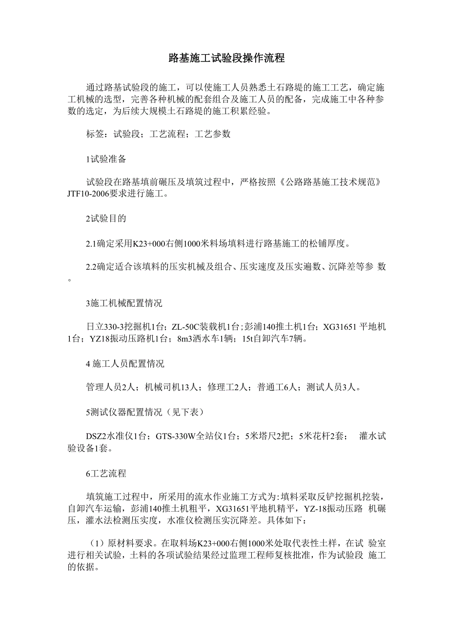 路基施工试验段操作流程通过路基试验段的施工,可以使施工人员熟悉土石路堤的施工工艺,确定施 工机械的选型,完善各种机械的配套组合及施工人员的配备,完成施工中各种参 数的选定,为后续大规模土石路堤的施工积累经验标签:试验段;工艺流程;工艺参数1试验准备试验段在路基填前碾压及填筑过程中,严格按照《公路路基施工技术规范》 JTF10-2006要求进行施工2试验目的2.1确定采用K23+000右侧1000米料场填料进行路基施工的松铺厚度2.2确定适合该填料的压实机械及组合、压实速度及压实遍数、沉降差等参 数3施工机械配置情况日立330-3挖掘机1台;ZL-50C装载机1台;彭浦140推土机1台;XG31651 平地机1台;YZ18振动压路机1台;8m3洒水车1辆;15t自卸汽车7辆4 施工人员配置情况管理人员2人;机械司机13人;修理工2人;普通工6人;测试人员3人5测试仪器配置情况(见下表)DSZ2水准仪1台;GTS-330W全站仪1台;5米塔尺2把;5米花杆2套; 灌水试验设备1套6工艺流程填筑施工过程中,所采用的流水作业施工方式为:填料采取反铲挖掘机挖装, 自卸汽车运输,彭浦140推土机粗平,XG31651平地机精平,YZ-18振动压路 机碾压,灌水法检测压实度,水准仪检测压实沉降差。