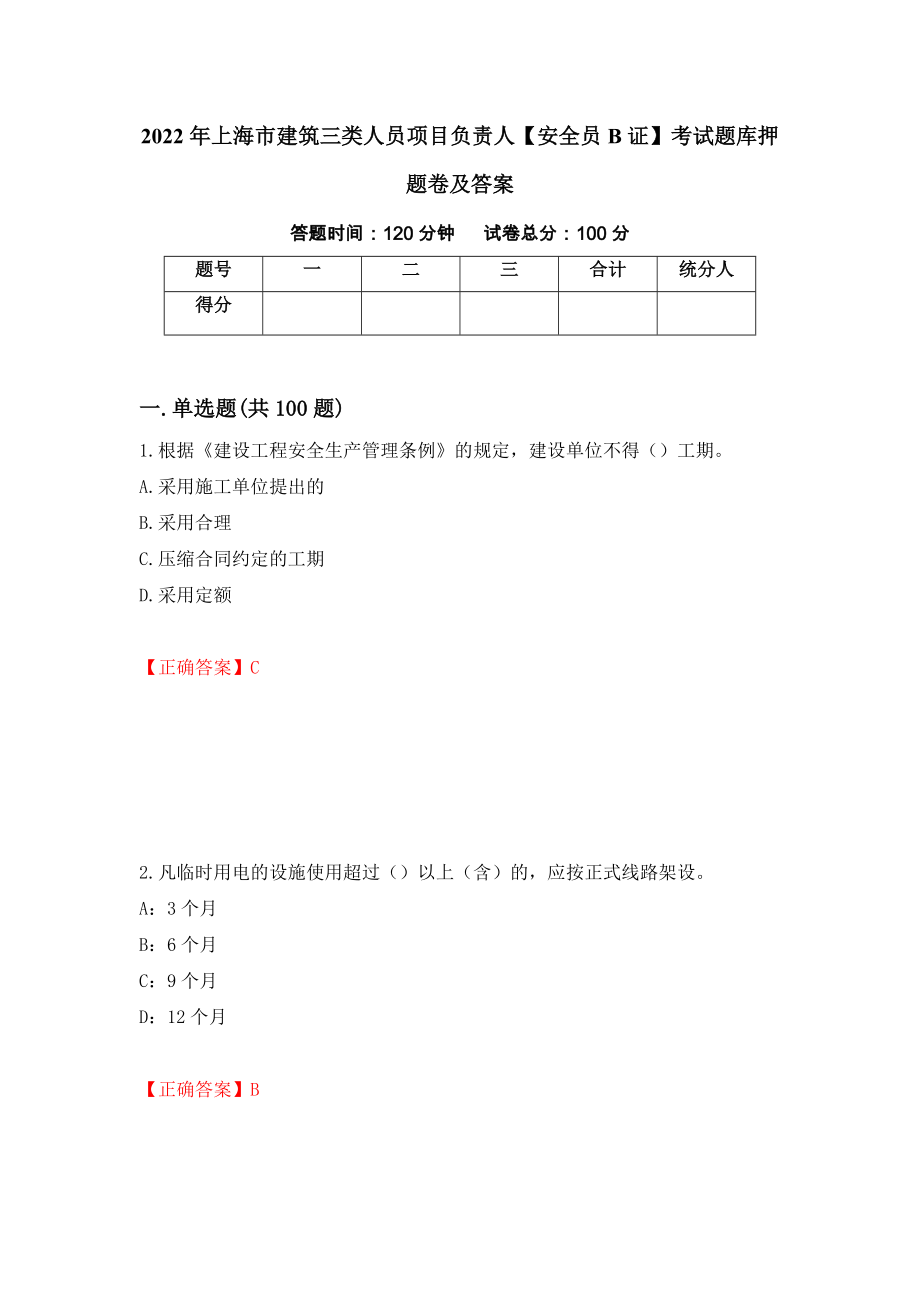 2022年上海市建筑三类人员项目负责人【安全员B证】考试题库押题卷及答案答题时间:120分钟 试卷总分:100分 题号一二三合计统分人得分 一.单选题(共100题)1.根据《建设工程安全生产管理条例》的规定,建设单位不得()工期A.采用施工单位提出的B.采用合理C.压缩合同约定的工期D.采用定额【正确答案】C2.凡临时用电的设施使用超过()以上(含)的,应按正式线路架设A:3个月B:6个月C:9个月D:12个月【正确答案】B3.根据《建筑施工碗扣式钢管脚手架安全技术规范》规定,脚手架模板支撑架应按先立杆、后水平杆、再斜杆的顺序搭设形成基本架体单元,并应以基本架体单元逐排、逐层扩展搭设成整体支撑架体系,每层搭设高度不宜大于().A.3mB.3.5mC.4mD.4.5m【正确答案】A4.搞好企业安全管理,避免工伤事故与职业病的发生,充分保护企业职工的安全与健康,是()的直接体现A.系统原理B.人本原理C.基本原理D.安全原理【正确答案】B5.()用于不适合再利用且不宜直接予以填埋处置的废物,尤其是对于受到病菌、病毒污染的物品,可以用焚烧进行无害化处理A.减量化处理B.稳定和固化技术C.焚烧技术D.回收利用【正确答案】C6.现场高大金属打架组做避雷接地,接地电阻值须()。
