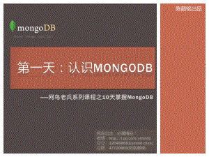 网鸟老兵系列课程之10天掌握MongoDB网鸟出击,必属精品!微博:http:/ chan)群:47700865(刺客巅峰)陈颜铭出品声明一哈本PPT根据MongoDB:The Definitive Guide原版制作而成;我很穷,但我大胆的承认我看的是盗版PDF;如果您发现翻译或描述有误,请不吝赐教;制作PPT时,我不一定会100%的引用书中提供的示例,看书的朋友不要见怪;如果有任何疑问请通过微博或QQ反馈给我;网鸟QQ群刺客巅峰(47700865)IT技术综合交流群组,这里神马都有。欢迎各种程序猿加入!NoSQL(23152359)新建的NoSQL专用群组,来吧!来吧!欢迎各位光临!研发团队(3178011)想入此群请先xx,呵呵,请先加老陈QQ(120468681)!声明功能丰富索引聚合分布式文件系统存储JavaScript定容集合可扩展性数据分片负载均衡海量数据支撑无模式非关系型面向文档的数据存储高性能空间预分配内存映射非事务性易管理Server自治机制自动故障转移动态集群MONGODB简介很多朋友将MongoDB亲切的译为“芒果”,老陈反对这个叫法,发音也相差较远,依着我,应该翻译为“猛狗”,酱紫才够强大够给力!数据库集合文档DatabaseCollectionDocumentDocumentCollectionDocumentMONGODB数据架构数据库任意UTF-8字符串(比如:网鸟);不能是空字符串;不得包含以下字符:(空格)、.、$、/、0;长度不得超过64字节;保留字:admin、local、config等;集合任意UTF-8字符串(比如:网鸟);不能是空字符串;不能包含0、$;不能以system.开头;文档任意UTF-8字符串(比如:网鸟);不能是空字符串;不能包含0、$;不能以_开头;数据库、集合、文档命名规范MongoDB的版本命名规范如:x.y.z;y为奇数时表示当前版本为开发版,如:1.5.1、1.7.2;y为偶数时表示当前版本为稳定版,如:1.6.3、1.8.2;详情:http:/www.mongodb.org/display/DOCS/Version+Numbers版本选择生产环境使用32位机器的,老陈无话可说,反正64位又运行不了,你没的选;在64位机器上坚决要使用64位版本,可以获得更大的内存映射空间,提升MongoDB的性能;至于操作系统,MongoDB是跨平台的,在下载页面找自己对应的版本即可;平台选择下载地址:http:/www.mongodb.org/downloads;直接运行:解压后,在命令行执行%setupPath%binmongod.exe即可;作为Windows服务:请参考http:/www.mongodb.org/display/DOCS/Windows+Service;其他操作系统请参考:http:/www.mongodb.org/display/DOCS/Quickstart;下载安装MONGODB的下载与安装 运行Shell 打开命令行;执行%setupPath%binmongo.exe即可进入MongoDB Shell;在MongoDB Shell中可以运行任何JavaScript脚本;在Shell中可以键入help以获取帮助,当然,都是E文的;数据操作 创建:db.test.insert(“Name”:“ymind chan”,“age”:8);读取:db.test.find(“Name”:“ymind chan”);更新:db.test.update(“Name”:“ymind chan”,“$set”:“age”:“5”);删除:db.test.remove(“Name”:“ymind chan”);MONGODB SHELL这里只是简单示例,更详细的教学还在后面!MongoDB底层使用Bson来维护数据,Bson是一种二进制下的类似于Json的数据格式。以下是MongoDB中几个值得啰嗦一下的数据类型:MONGODB的数据类型MongoDB的基本数据类型MongoDB的数组MongoDB的文档嵌套MongoDB的ObjectIdMONGODB的基本数据类型这个有神马好说的?nulltrue、false;bool仅支持64位浮点数,其他类型的数字会自动转化为此格式;数字支持UTF-8字符集;字符串存储标准纪元开始的毫秒数,不含时区;日期符合JavaScript语法的正则表达式;regex任何JavaScript代码;code可存储任意字节数的字节数组,但在Shell中无法使用;binary对象集合或列表在MongoDB可以被存储为数组;数组一个文档可以包含另外一个文档;嵌套文档详细内容请参考http:/bsonspec.org/#/specification;其他MongoDB中的数组既可以作为有序对象(如列表)来操作,也可以作为无序对象(如集合)来操作。MongoDB可以以原子操作的形式来修改或删除数组中的元素。下面是一个数组示例(不用怀疑,这就是Json语法):MONGODB的数组/这个不是数组Status:0,/这个是空数组Messages:,/包含3个元素的数组ResponseBody:h010t00101025,h010t00101039,h010t00101040“文档式存储的特色就是允许文档对象的嵌套,这能够使我们的实体数据在MongoDB的存在形式更加自然。老陈忠告:不要滥用嵌套文档,对于需要复杂运算才能完成的嵌套应当使用外键模式来解决,否则之后的DAL(Data Access Layer,数据访问层)开发会相当痛苦!以下是一个嵌套文档的格式示例:MONGODB的文档嵌套/根文档 Status:0,/嵌套文档ResponseBody:CityName:北京,Keyword:钓鱼台,/再套一个数组,数组的每个元素又是文档,NB吧!Landmarks:“Name”:“北京钓鱼台国际旅行社”,Name:钓鱼台“ObjectId是_id(貌似前面木有提过?木有关系,_id是MongoDB在每个文档中的默认唯一标识的名称)的默认类型。ObjectId的结构如下:MONGODB的OBJECTID如上图所述,ObjectId可以保证同一台机器上不同进程(即MongoDB实例)生成的值都是唯一的。详情请参考:http:/www.mongodb.org/display/DOCS/Object+IDs注意事项:当插入的文档并没有指定_id的时候,MongoDB会自动创建,并使用ObjectId类型;_id可以被指定为其他的类型,比如整数;关于自增标识,MongoDB没有内置自增标识,在目前的roadmap中也没有相关的规划,自定义自增标识的方法将会在后续内容中专门讲解;采纳老陈接触MongoDB一年多了,已经被彻底征服;我自己的项目()已经完全抛弃了关系型数据库;缺点最大的缺点就是无法支持复杂运算,因为按照MongoDB的架构思想来说呢,是想把这些都转移到驱动或App上;为了解决这个缺点,老陈自行研发了EntityDB与之互补(小声的说一句:EntityDB是使用C#开发的内存数据库托管框架,以较低的硬件成本换取