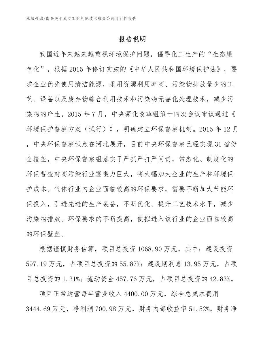 泓域咨询/南昌关于成立工业气体技术服务公司可行性报告报告说明我国近年来越来越重视环境保护问题,倡导化工生产的“生态绿色化”,根据2015年修订实施的《中华人民共和国环境保护法》,要求企业优先使用清洁能源,采用资源利用率高、污染物排放量少的工艺、设备以及废弃物综合利用技术和污染物无害化处理技术,减少污染物的产生2015年7月,中央深化改革组第十四次会议审议通过《环境保护督察方案(试行)》,明确建立环保督察机制2015年12月,中央环保督察试点在河北展开,目前中央环保督察已经实现31省份全覆盖,中央环保督察组落实了严抓严打严问责,常态化、制度化的环保督查对高污染行业震慑力巨大,将大幅加大企业的生产和环境保护成本气体行业内企业面临较高的环保要求,需要不断加大节能环保投入,引进先进的生产装备,不断优化、提升工艺技术水平,减少污染物排放环保要求的不断提高,使拟进入该行业的企业面临较高的环保壁垒根据谨慎财务估算,项目总投资1068.90万元,其中:建设投资597.19万元,占项目总投资的55.87%;建设期利息13.95万元,占项目总投资的1.31%;流动资金457.76万元,占项目总投资的42.83%。