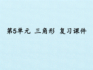 经营者提供商品或者服务有欺诈行为的,应当按照消费者的要求增加赔偿其受到的损失,增加赔偿的金额为消费者购买商品的价款或接受服务的费用第第5 5单元单元 三角形三角形 复习复习课件课件经营者提供商品或者服务有欺诈行为的,应当按照消费者的要求增加赔偿其受到的损失,增加赔偿的金额为消费者购买商品的价款或接受服务的费用三角形的特性三角形的特性三角形的分类三角形的分类三角形的认识三角形的认识三角形的特性三角形的特性三角形三边的关系三角形三边的关系三角形的内角和三角形的内角和三角形三角形一、归纳整理一、归纳整理经营者提供商品或者服务有欺诈行为的,应当按照消费者的要求增加赔偿其受到的损失,增加赔偿的金额为消费者购买商品的价款或接受服务的费用由由三条线段三条线段围成的图形叫做围成的图形叫做三角形三角形(每相邻两条线段的端点相连)。(每相邻两条线段的端点相连)。什么样的图形叫三角形?什么样的图形叫三角形?三条线段三条线段(一)三角形的特性(一)三角形的特性二、整理复习二、整理复习经营者提供商品或者服务有欺诈行为的,应当按照消费者的要求增加赔偿其受到的损失,增加赔偿的金额为消费者购买商品的价款或接受服务的费用边边边边边边顶点顶点顶点顶点顶点顶点角角角角角角三角形都有三角形都有3条边、条边、3个角、个角、3个顶点个顶点。(一)三角形的特性(一)三角形的特性二、整理复习二、整理复习三角形的特点三角形的特点经营者提供商品或者服务有欺诈行为的,应当按照消费者的要求增加赔偿其受到的损失,增加赔偿的金额为消费者购买商品的价款或接受服务的费用ABC 用字母用字母A A、B B、C C分别表示三角形的三个分别表示三角形的三个顶点,上面的三角形可以表示成顶点,上面的三角形可以表示成三角形三角形ABCABC。(二)(二)三角形的特性三角形的特性二、整理复习二、整理复习经营者提供商品或者服务有欺诈行为的,应当按照消费者的要求增加赔偿其受到的损失,增加赔偿的金额为消费者购买商品的价款或接受服务的费用 从从三角形的一个三角形的一个顶点顶点到它的到它的对边对边做一条做一条垂线垂线,顶点顶点和和垂足垂足之间的之间的线线段段叫叫三角形的高三角形的高,这条,这条对边对边叫做叫做三三角形的底角形的底。(三)(三)三角形的特性三角形的特性二、整理复习二、整理复习什么叫三角形的高和底?什么叫三角形的高和底?经营者提供商品或者服务有欺诈行为的,应当按照消费者的要求增加赔偿其受到的损失,增加赔偿的金额为消费者购买商品的价款或接受服务的费用三角形的高底底顶点顶点高高ABC二、整理复习二、整理复习(一)三角形的特性(一)三角形的特性经营者提供商品或者服务有欺诈行为的,应当按照消费者的要求增加赔偿其受到的损失,增加赔偿的金额为消费者购买商品的价款或接受服务的费用底底高高底底高高底底高高BACAABBCC二、整理复习二、整理复习(一)三角形的特性(一)三角形的特性经营者提供商品或者服务有欺诈行为的,应当按照消费者的要求增加赔偿其受到的损失,增加赔偿的金额为消费者购买商品的价款或接受服务的费用底底高高底底底底高高高高CAB二、整理复习二、整理复习(一)三角形的特性(一)三角形的特性经营者提供商品或者服务有欺诈行为的,应当按照消费者的要求增加赔偿其受到的损失,增加赔偿的金额为消费者购买商品的价款或接受服务的费用三角形具有三角形具有稳定性稳定性二、整理复习二、整理复习(一)三角形的特性(一)三角形的特性自行车的车架、房屋的支架、篱笆自行车的车架、房屋的支架、篱笆等等。经营者提供商品或者服务有欺诈行为的,应当按照消费者的要求增加赔偿其受到的损失,增加赔偿的金额为消费者购买商品的价款或接受服务的费用经营者提供商品或者服务有欺诈行为的,应当按照消费者的要求增加赔偿其受到的损失,增加赔偿的金额为消费者购买商品的价款或接受服务的费用经营者提供商品或者服务有欺诈行为的,应当按照消费者的要求增加赔偿其受到的损失,增加赔偿的金额为消费者购买商品的价款或接受服务的费用两点间所有连线中两点间所有连线中线段最短线段最短,这条线段,这条线段的长度叫做的长度叫做两点间的两点间的距离距离二、整理复习二、整理复习1、三角形的特性、三角形的特性(试卷第三题(试卷第三题 第五题第第五题第1题)题)经营者提供商品或者服务有欺诈行为的,应当按照消费者的要求增加赔偿其受到的损失,增加赔偿的金额为消费者购买商品的价款或接受服务的费用2 2、三角形、三角形的三边的三边关系(试卷第三、关系(试卷第三、四题)四题)三角形三角形任意任意两边之两边之和和大于大于第三边。第三边。简便方法:简便方法:较短较短两边之和大于第三边。两边之和大于第三边。6cm 7cm 8cm 二、整理复习二、整理复习(一)三角形的特性(一)三角形的特性经营者提供商品或者服务有欺诈行为的,应当按照消费者的要求增加赔偿其受到的损失,增加赔偿的金额为消费者购买商品的价款或接受服务的费用判断下面哪组小棒能围成三角形?判断下面哪组小棒能围成三角形?(1)4cm 5cm 9cm (2)3cm 6cm 10cm4+5=94+5=9,不能不能围成三角形