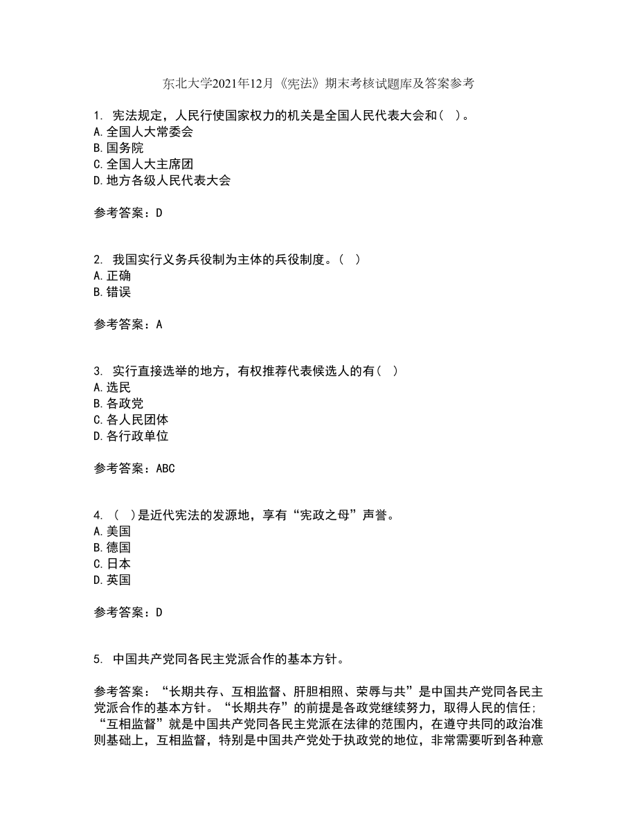 东北大学2021年12月《宪法》期末考核试题库及答案参考1. 宪法规定,人民行使国家权力的机关是全国人民代表大会和( )A.全国人大常委会B.国务院C.全国人大主席团D.地方各级人民代表大会参考答案:D2. 我国实行义务兵役制为主体的兵役制度 )A.正确B.错误参考答案:A3. 实行直接选举的地方,有权推荐代表候选人的有( )A.选民B.各政党C.各人民团体D.各行政单位参考答案:ABC4. ( )是近代宪法的发源地,享有“宪政之母”声誉A.美国B.德国C.日本D.英国参考答案:D5. 中国共产党同各民主党派合作的基本方针参考答案:“长期共存、互相监督、肝胆相照、荣辱与共”是中国共产党同各民主党派合作的基本方针长期共存”的前提是各政党继续努力,取得人民的信任;“互相监督”就是中国共产党同各民主党派在法律的范围内,在遵守共同的政治准则基础上,互相监督,特别是中国共产党处于执政党的地位,非常需要听到各种意见和批评,接受广大人民群众的监督,各民主党派是反映人民群众意见和发挥监督作用的一条重要渠道6. 我国中央军事委员会实行( )A.委员会集体领导制B.军委主席、副主席负责制C.军委主席负责制D.军委党委负责制参考答案:C7. 国家主席、副主席由全国人民代表大会选举产生。