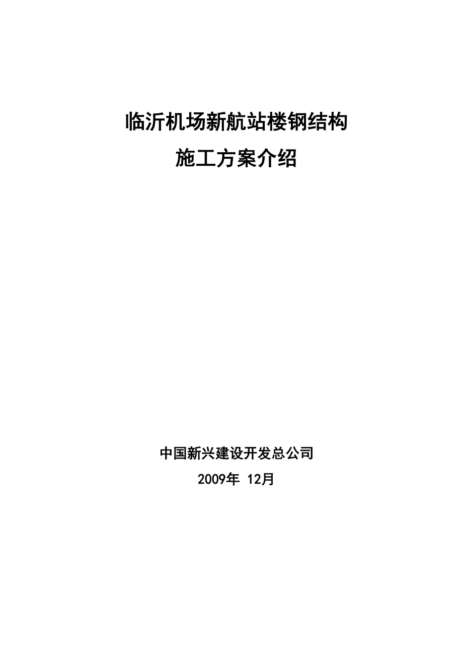 临沂机场新航站楼钢结构施工方案介绍中国新兴建设开发总公司2009年 12月目录1、工程概况 12、总体施工部署 33、钢结构加工 44、桁架柱安装 55、桁架梁安装 86、桁架连杆安装 137、天窗支架安装 138、冬期施工主要措施 141、工程概况工程名称:临沂机场新航站楼工程建设单位:临沂市民用航空管理局设计单位:上海联创建筑设计有限公司 监理单位:临沂市建设工程监理公司 钢结构施工单位:中国新兴建设开发总公司 钢结构工期要求:主体结构 63 天 质量要求:合格临沂机场新航站楼位于临沂市河东区机场路 1 号,紧邻旧航站楼整个候机楼南北长度 为 151 米,宽为 67 米(屋面平面投影),混凝土结构地上一层,局部二层无地下室建筑 面积:10117 m?,钢结构总量约:800t整个候机楼屋面为双曲形状钢结构共分为以下几个 部分:桁架柱、桁架梁、柱间支撑,柱间系杆,水平支撑,垂直支撑,天窗架桁架柱、桁架梁均为平面管桁架结构,共16榀,桁架柱标高:24m,桁架梁跨度51米, 最高处25米西侧悬挑桁架8m,东侧悬挑桁架4.5m西侧桁架柱柱底标高一0.400,东侧桁 架柱在混凝土结构上,柱底标高 5.300。