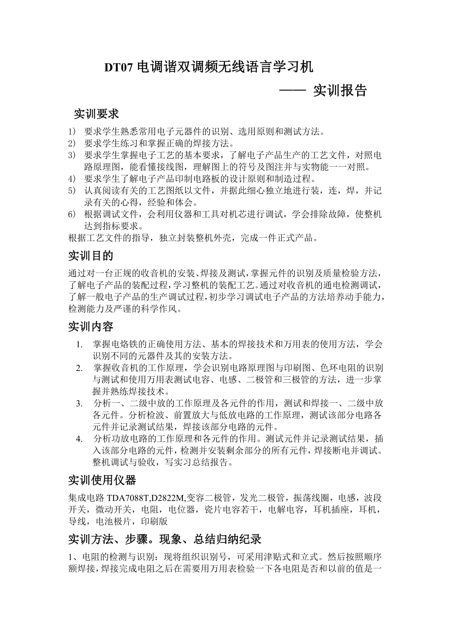 DT07电调谐双调频无线语言学习机 —— 实训报告 实训要求1) 要求学生熟悉常用电子元器件的识别、选用原则和测试方法2) 要求学生练习和掌握正确的焊接方法3) 要求学生掌握电子工艺的基本要求,了解电子产品生产的工艺文件,对照电路原理图,能看懂接线图,理解图上的符号及图注并与实物能一一对照4) 要求学生了解电子产品印制电路板的设计原则和制造过程5) 认真阅读有关的工艺图纸以文件,并据此细心独立地进行装,连,焊,并记录有关的心得,经验和体会6) 根据调试文件,会利用仪器和工具对机芯进行调试,学会排除故障,使整机达到指标要求根据工艺文件的指导,独立封装整机外壳,完成一件正式产品实训目的通过对一台正规的收音机的安装、焊接及测试,掌握元件的识别及质量检验方法,了解电子产品的装配过程,学习整机的装配工艺通过对收音机的通电检测调试,了解一般电子产品的生产调试过程,初步学习调试电子产品的方法培养动手能力,检测能力及严谨的科学作风实训内容1. 掌握电烙铁的正确使用方法、基本的焊接技术和万用表的使用方法,学会识别不同的元器件及其的安装方法。