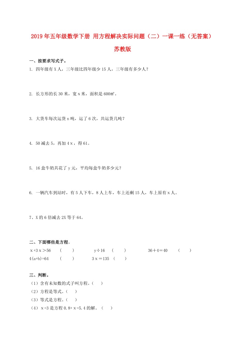 2019年五年级数学下册 用方程解决实际问题(二)一课一练(无答案) 苏教版一、按要求写式子1. 四年级有X人,三年级比四年级少15人,三年级有多少人?2. 长方形的长30米,宽ⅹ米,面积是600㎡3. 大货车每次运货n吨,运了6次,共运货几吨?4. 50减去5,再加4ⅹ,得615. 16盒牛奶共花了y元,平均每盒牛奶多少元?6. 一辆汽车到站时,有5人下车,8人上车,车上还剩15人,车上原有ⅹ人7、X的6倍减去2X等于64二、下面哪些是方程ⅹ+3ⅹ>56 ( ) y16( ) 36+4=40 ( )4(a+b)=64 ( ) 3ⅹ=135 ( )三、判断1)含有未知数的式子叫方程 ) (2)方程是等式 )(3)等式是方程 ) (4)ⅹ=3是方程0.8+ⅹ=5.4的解 )四、解方程强调解方程要验算)6ⅹ-2X=64 30ⅹ=600 50-5+4ⅹ=61 3ⅹ=6 30—ⅹ=6 ⅹ-5+8=15五、列方程解答。
