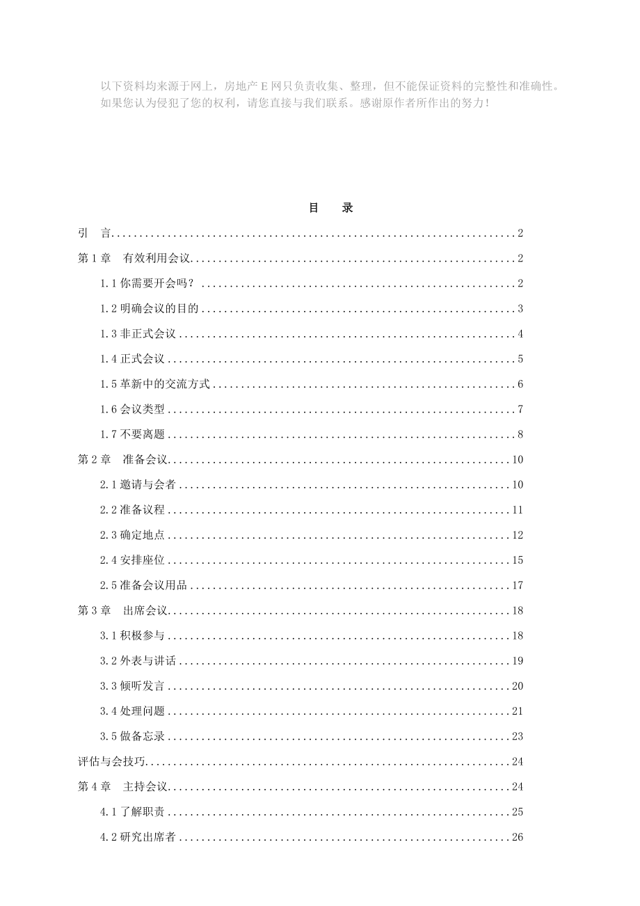 以下资料均来源于网上,房地产E网只负责收集、整理,但不能保证资料的完整性和准确性如果您认为侵犯了您的权利,请您直接与我们联系感谢原作者所作出的努力!目 录引 言 2第1章 有效利用会议 21.1你需要开会吗? 21.2明确会议的目的 31.3非正式会议 41.4正式会议 51.5革新中的交流方式 61.6会议类型 71.7不要离题 8第2章 准备会议 102.1邀请与会者 102.2准备议程 112.3确定地点 122.4安排座位 152.5准备会议用品 17第3章 出席会议 183.1积极参与 183.2外表与讲话 193.3倾听发言 203.4处理问题 213.5做备忘录 23评估与会技巧 24第4章 主持会议 244.1了解职责 254.2研究出席者 264.3掌握会议节奏 274.4控制会议 284.5维持秩序 304.6结束会议 324.7运用正规程序 344.8解决正式会议上的问题 36主持能力自测 37成功会议管理技巧若想成功地管理会议,你要学习这些技巧:从构划和准备议程,到建立正式程序,以及处理易爆局面《会议管理》不仅教你全面主持会议以及充分参与会议,而且为你提供实用方法使会议达到预定目的。