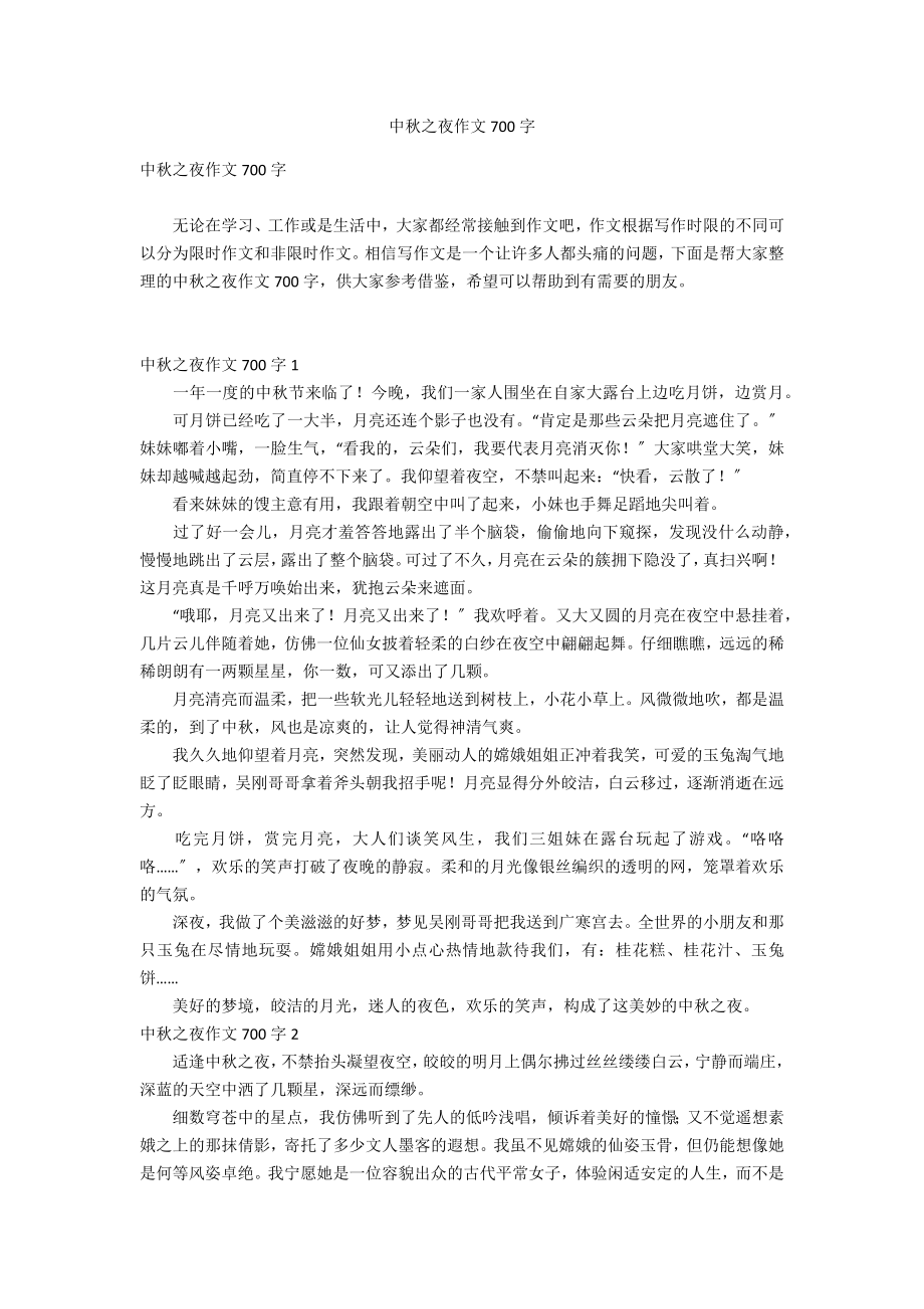 虽然以明月寄乡思,但天气原因,有些省份是看不到月亮的,只能在心中默念一遍、两遍、三遍…… 今天的记忆我依旧清晰,下地弯腰割韭菜、除草,坐在土地上择着韭菜,累了,就站起来,继续择择完后,捧着择好的菜回到家,清洗一两遍起初,一个人在菜地割韭菜,想着这与中秋节也没有多大关系,看来这只是普普通通的团聚一次,吃一次月饼,赏一次月罢一个人,望着田野,清风肆意挥霍脸颊,风吹草动,虫鸟交响,轻柔缓慢而夜色中的景,却与其大不相同圆月和云,象征着相聚;白色和云,象征着繁忙 这个中秋,不冷不热,像在欲擒故纵着我们的心远方的啊,是时候回来,看看已故仍留的亲人吧迂回久了,就会失去什么,纠缠久了,也会浪费什么,只有你拉我扯,才能显得更有人情味呢…… 月光依旧皎洁,暮色中,苍茫而甘甜的中秋节,又一次把人与人的感情拉进中秋之夜,晚安中秋之夜作文700字10 中秋之夜,我们全家在月光女神的照耀下散步,她用她毫无保存地将月光洒在大地上,滋润着大地上每一个生灵此时此刻,漫步在银色的地毯上,让我回想起四年前的那个中秋之夜…… 四年前的一个星期三,应该是全家人尽情享受这“海上升明月,天涯共此时〞的夜晚,而我们这些寄宿生,只能在学校与同学们共度月光普照的时刻。
