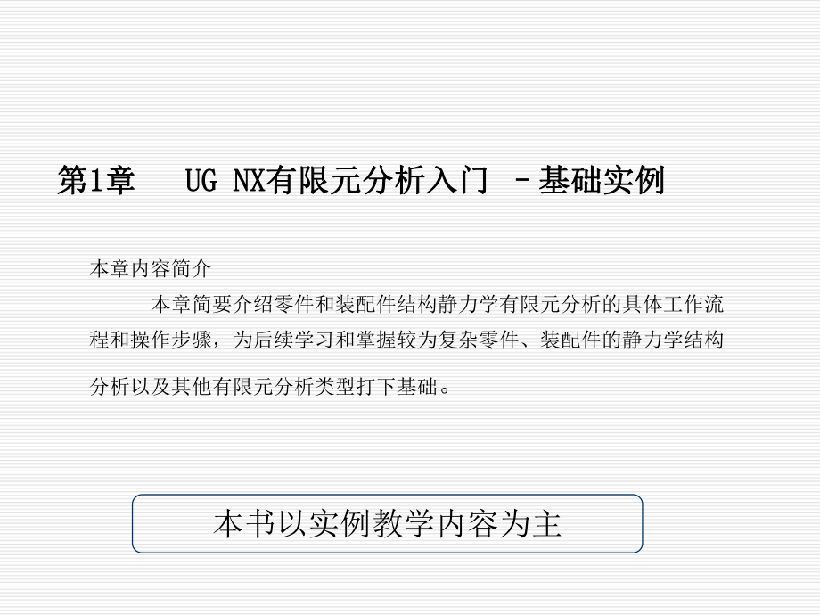 1.2.5 1.2.5 本节小结本节小结o本实例主要介绍FEM环境下的非关联装配方法、网格连接中的【面对面接触】选项和参数的设置方法,以及接触输出结果的设置方法等,工程实例中装配体的有限元分析十分常见,在实践操作中需要掌握装配FEM模型以及网格连接的基本方法,为分析大型装配体的结构分析打下基础1.3 1.3 本章小结本章小结o(1)本章节通过简单零件和装配组件有限元分析实例,在介绍各自工作流程和操作步骤的基础上,重点介绍了材料的自定义、网格细化、FEM模型装配及面面接触网格连接等操作方法、命令中参数设置要点等内容,为后续进一步学习复杂有限元分析类型打下基础o(2)本书编写的宗旨在于提高软件运用水平和操作能力,引导UG NX CAE初学者采用有限元软件去解决实际问题的思路、基本操作方法,限于篇幅,本实例和后续实例涉及有限元法基础、力学理论和专业知识等方面的内容不再详细赘述o(3)本实例中所使用的模型及边界条件与实际情况相比,兼顾了求解精度和计算成本,很多方面采取了简化和假设,读者在做实际项目分析时,以实际的边界约束与载荷为准,可以参照本书中实例所提供的有关分析方法,但是,计算结果不具有对比性和参考性。