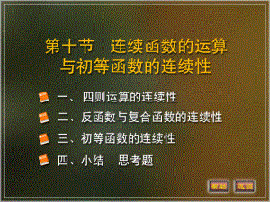 一、四则运算的连续性一、四则运算的连续性定理定理1 1.)0)()()(),()(),()(,)(),(000处也连续处也连续在点在点则则处连续处连续在点在点若函数若函数xxgxgxfxgxfxgxfxxgxf 例如例如,),(cos,sin内连续内连续在在xx.csc,sec,cot,tan在其定义域内连续在其定义域内连续故故xxxx二、反函数与复合函数的连续性二、反函数与复合函数的连续性定理定理2 2 严格单调的连续函数必有严格单调的连严格单调的连续函数必有严格单调的连续反函数续反函数.例如例如,2,2sin上单调增加且连续上单调增加且连续在在 xy.1,1arcsin上也是单调增加且连续上也是单调增加且连续在在故故 xy;1,1arccos上单调减少且连续上单调减少且连续在在同理同理 xy.,cot,arctan上单调且连续上单调且连续在在 xarcyxy反三角函数在其定义域内皆连续反三角函数在其定义域内皆连续.定理定理3 3).(lim)()(lim,)(,)(lim000 xfafxfaufaxxxxxxx 则有则有连续连续在点在点函数函数若若证证,)(连续连续在点在点auuf.)()(,0,0成立成立恒有恒有时时使当使当 afufau,)(lim0axxx 又又,0,0,00时时使当使当对于对于 xx.)(成立成立恒有恒有 auax将上两步合起来将上两步合起来:,0,0,00时时使当使当 xx)()()()(afxfafuf .成立成立 )()(lim0afxfxx ).(lim0 xfxx 意义意义1.极限符号可以与函数符号互换极限符号可以与函数符号互换;.)(.2的的理理论论依依据据变变量量代代换换xu 例例1 1.)1ln(lim0 xxx 求求.1 xxx10)1ln(lim 原式原式)1(limln10 xxx eln 解解例例2 2.1lim0 xexx 求求.1)1ln(lim0yyy 原式原式解解,1yex 令令),1ln(yx 则则.0,0yx时时当当yyy10)1ln(1lim 同理可得同理可得.ln1lim0axaxx .)(,)(,)(,)(00000也连续也连续在点在点则复合函数则复合函数连续连续在点在点而函数而函数且且连续连续在点在点设函数设函数xxxfyuuufyuxxxxu 定理定理4 4注意注意定理定理4是定理是定理3的特殊情况的特殊情况.例如例如,),0()0,(1内连续内连续在在 xu,),(sin内连续内连续在在 uy.),0()0,(1sin内连续内连续在在 xy三、初等函数的连续性三、初等函数的连续性三角函数及反三角函数在它们的定义域内是三角函数及反三角函数在它们的定义域内是连续的连续的.)1,0(aaayx指数函数指数函数;),(内单调且连续内单调且连续在在)1,0(log aaxya对数函数对数函数;),0(内单调且连续内单调且连续在在定理定理5 5 基本初等函数在定义域内是连续的基本初等函数在定义域内是连续的.xy xaalog ,uay .log xua ,),0(内连续内连续在在 ,不同值不同值讨论讨论(均在其定义域内连续均在其定义域内连续)定理定理6 6 一切初等函数在其一切初等函数在其定义区间定义区间内都是连内都是连续的续的.定义区间是指包含在定义域内的区间定义区间是指包含在定义域内的区间.1.初等函数仅在其定义区间内连续初等函数仅在其定义区间内连续,在在其定义域内不一定连续其定义域内不一定连续;例如例如,1cos xy,4,2,0:xD这些孤立点的邻域内没有定义这些孤立点的邻域内没有定义.,)1(32 xxy,1,0:xxD及及在在0点的邻域内没有定义点的邻域内没有定义.),1上连续上连续函数在区间函数在区间注意注意注意注意2.初等函数求极限的方法初等函数求极限的方法代入法代入法.例例3 3.1sinlim1 xxe求求1sin1 e原式原式.1sin e例例4 4.11lim20 xxx 求求解解解解)11()11)(11(lim2220 xxxxx原式原式11lim20 xxx20.0)()()(lim000定义区间定义区间 xxfxfxx四、小结四、小结连续函数的和差积商的连续性连续函数的和差积商的连续性.复合函数的连续性复合函数的连续性.初等函数的连续性初等函数的连续性.定义区间与定义域的区别定义区间与定义域的区别;求极限的又一种方法求极限的又一种方法.两个定理两个定理;两点意义两点意义.反函数的连续性反函数的连续性.思考题思考题 设设xxfsgn)(,21)(xxg ,试试研研究究复复合合函函数数)(xgf与与)(xfg的的连连续续性性.思考题解答思考题解答21)(xxg )1sgn()(2xxgf 1 2sgn1)(xxfg 0,10,2xx在在),(上上处处处处连连续续)(xgf在在)0,(),0(上上处处处处连连续续)(xfg0 x是它的可去间断点是它的可去间断点 0,10,00,1)(xxxxf一、一、填空题:填空题:1 1、43lim20 xxx_.2 2、xxx11lim0_.3 3、)2cos2ln(lim6xx _._.4 4、xxx24tancos22lim _.5 5、tett1lim2_.6 6、设、设,0,0,)(xxaxexfx 当当 a_时,时,)(xf在在 ),(上连续上连续.练练 习习 题题7 7、函数函数61)(24 xxxxxf的连续区间为的连续区间为 _._.8 8、设设 时时当当时时当当1,11,2cos)(xxxxxf确定确定 )(lim21xfx_;)(lim1xfx_._.二、二、计算下列各极限:计算下列各极限:1 1、axaxax sinsinlim;2 2、xxxcot20)tan31(lim;3 3、1)1232(lim xxxx;三、三、设设 0),ln(0,10,)(22xxxbxxxaxf已知已知)(xf在在 0 x处连续,试确处连续,试确 定定a和和b的值的值.四、四、设函数设函数)(xf在在0 x处连续,且处连续,且0)0(f,已知已知)()(xfxg,试证函数,试证函数)(xg在在0 x处也连续处也连续.一、一、1 1、2 2;2 2、21;3 3、0 0;4 4、0 0;5 5、)11(212 e;6 6、1 1;7 7、),2(),2,3(),3,(;8 8、22,0,0,不存在不存在.二、二、1 1、acos;2 2、1 1;3 3;21e.三、三、eba ,1.练习题答案练习题答案