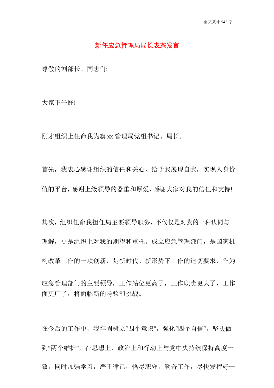 全文共计 543 字新任应急管理局局长表态发言尊敬的刘部长、同志们:大家下午好!刚才组织上任命我为旗 xx 管理局党组书记、局长首先,我衷心感谢组织的信任和关心,给予我展现自我,实现人身价值的平台,感谢上级领导的器重和厚爱,感谢大家对我的信任和支持!其次,组织任命我担任局主要领导职务,不仅仅是对我的一种认同与理解,更是组织上对我的期望和重托成立应急管理部门,是国家机构改革工作的一项创新,是新时代、新形势下工作的迫切要求,作为应急管理部门的主要领导,工作站位更高了,工作职责更大了,工作 面更广了,将面临新的考验和挑战在今后的工作中,我牢固树立“四个意识”,强化“四个自信”,坚决做到“两个维护”,在思想上、政治上和行动上与党中央持续保持高度一致,同时加强学习,严于律己,恪尽职守,勤奋工作,尽快发挥好一把手作用,坚决维护、执行旗委、旗政府的各项决策部署和上级应急管理部门的指导精神,扎实工作,攻坚克难,主动担当,深入推进应急管理事业改革发展,把应急管理放在经济社会发展全局中去思考谋1全文共计 543 字划,把握好稳增长与防风险的关系,明确工作目标,认真履行职责,有效防范化解重大安全风险,为经济社会发展提供安全保障,向旗委、 旗政府交上一份满意的答卷。