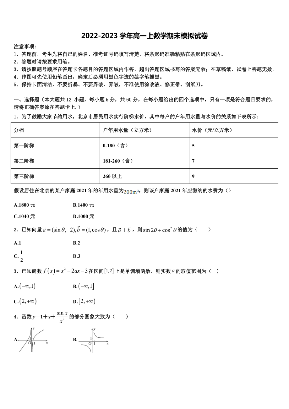 2022-2023学年高一上数学期末模拟试卷注意事项:1.答题前,考生先将自己的姓名、准考证号码填写清楚,将条形码准确粘贴在条形码区域内2.答题时请按要求用笔3.请按照题号顺序在答题卡各题目的答题区域内作答,超出答题区域书写的答案无效;在草稿纸、试卷上答题无效4.作图可先使用铅笔画出,确定后必须用黑色字迹的签字笔描黑5.保持卡面清洁,不要折暴、不要弄破、弄皱,不准使用涂改液、修正带、刮纸刀一、选择题(本大题共12 小题,每小题5分,共60分,在每小题给出的四个选项中,只有一项是符合题目要求的,请将正确答案涂在答题卡上.)1.为了鼓励大家节约用水,北京市居民用水实行阶梯水价,其中每户的户年用水量与水价的关系如下表所示:分档户年用水量(立方米)水价(元/立方米)第一阶梯0-180(含)5第二阶梯181-260(含)7第三阶梯260以上9假设居住在北京的某户家庭2021年的年用水量为,则该户家庭2021年应缴纳的水费为()A.1800元 B.1400元C.1040元 D.1000元2.已知向量,且,则的值为( )A.1 B.2C. D.33.已知函数在区间上是单调增函数,则实数的取值范围为( )A. B.C. D.4.函数y=1+x+的部分图象大致为( )A. B.C. D.5.若直线与直线垂直,则()A.6 B.4C. D.6.关于函数,下列说法正确的是()A.最小值为0 B.函数为奇函数C.函数是周期为周期函数 D.函数在区间上单调递减7.满足的角的集合为()A. B.C. D.8.已知是偶函数,且在上是减函数,又,则的解集为()A. B.C. D.9.已知全集,集合,,它们的关系如图(Venn图)所示,则阴影部分表示的集合为( )A. B.C. D.10.在同一直角坐标系中,函数的图像可能是( )A. B.C. D.11.有一组实验数据如下表所示:1.93.04.0516.11.54.07.512.018.0现准备用下列函数中的一个近似地表示这些数据满足的规律,其中最接近的一个是( )A. B.C. D.12.已知,则( ).A. B.C. D.二、选择题(本大题共4小题,每小题5分,共20分,将答案写在答题卡上.) 13.已知是幂函数,且在区间是减函数,则m=_____________.14.已知,若,则_______;若,则实数的取值范围是__________15.函数的定义域是____________.(用区间表示)16.平面向量,,(R),且与的夹角等于与的夹角,则___.三、解答题(本大题共6个小题,共70分。