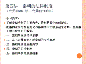 第四讲秦朝的法律制度第四讲秦朝的法律制度(公元前(公元前361361年年公元前公元前206206年)年)学习要求:学习要求:了解秦朝法制的主要内容,特别是其中的创新点。了解秦朝法制的主要内容,特别是其中的创新点。把秦的法制与社会变化与秦朝的灭亡联系起来考察,总结秦把秦的法制与社会变化与秦朝的灭亡联系起来考察,总结秦王朝二世而亡的教训。王朝二世而亡的教训。一、秦朝的立法指导思想一、秦朝的立法指导思想二、从二、从云梦秦简云梦秦简看秦朝的立法概况看秦朝的立法概况三、秦朝法律的主要内容三、秦朝法律的主要内容四、秦朝的司法制度四、秦朝的司法制度五、秦朝法制的发展结果五、秦朝法制的发展结果秦朝的疆域秦朝的疆域秦兵马俑秦兵马俑一、商鞅变法与秦律的制定一、商鞅变法与秦律的制定(一)商鞅定秦律(一)商鞅定秦律1 1、秦律的制定背景、秦律的制定背景 2 2、商鞅变法的主要内容、商鞅变法的主要内容(1 1)法律方面的举措:)法律方面的举措:A A改法为律,制定秦律改法为律,制定秦律 ;B B轻罪重罚轻罪重罚(连坐),奖励告奸(连坐),奖励告奸(2 2)经济方面:重农抑商,奖励耕织。)经济方面:重农抑商,奖励耕织。A A废井田,开阡陌,废井田,开阡陌,民得买卖;民得买卖;B B奖励耕织、开荒。奖励耕织、开荒。(3 3)政治方面:剥夺旧贵族的特权:)政治方面:剥夺旧贵族的特权:A A废除分封制,实行县废除分封制,实行县制;制;B B废除爵位世袭制,实行论军功封爵制。废除爵位世袭制,实行论军功封爵制。和军功,制军爵律(和军功,制军爵律(分户令分户令)(4 4)统一度量衡。)统一度量衡。3 3、商鞅变法的意义、商鞅变法的意义:使秦国强大、使法制发展、国家统一使秦国强大、使法制发展、国家统一商鞅商鞅二、秦朝的立法指导思想及其特点二、秦朝的立法指导思想及其特点(一一)以法家理论为核心(以法家理论为核心(P54P54)1 1、以法为本、以法为本,法、术、势结合;法、术、势结合;2 2、缘法而治,一断于法、缘法而治,一断于法;3;3、法令、法令由一统(立法权、法律内容和司法的统一)由一统(立法权、法律内容和司法的统一);4;4、重刑主义的刑法、重刑主义的刑法原则原则(重型轻罪、不宥不赦、刑用于将过、重赏告奸、增设酷刑重型轻罪、不宥不赦、刑用于将过、重赏告奸、增设酷刑);(二)重视用法律手段调整社会关系(二)重视用法律手段调整社会关系,法律内容名目繁多法律内容名目繁多.(治道运治道运行、诸产得宜,皆有法式行、诸产得宜,皆有法式)(三)刑法手段残酷落后(三)刑法手段残酷落后.(四四)否认礼治教化的作用,强调刑法的严厉残酷。否认礼治教化的作用,强调刑法的严厉残酷。(五)强化专制统治,建立皇帝制度,赋予皇帝种种特权。(五)强化专制统治,建立皇帝制度,赋予皇帝种种特权。三、从三、从云梦秦简云梦秦简看秦的立法概况(一)看秦的立法概况(一)19751975年年1212月,在湖北省云梦县城关睡虎地十一号秦墓发掘中,月,在湖北省云梦县城关睡虎地十一号秦墓发掘中,出土了大量记载秦法律令的竹简,称之为出土了大量记载秦法律令的竹简,称之为“云梦秦简云梦秦简”。“云梦秦简云梦秦简”共一千一百多枚,内容非常丰富,绝大部分是共一千一百多枚,内容非常丰富,绝大部分是秦的法律令文书。秦的法律令文书。据考证,十一号秦墓的主人叫据考证,十一号秦墓的主人叫“喜喜”,曾任一些与司法有关,曾任一些与司法有关的职务。他生前根据工作的需要,抄录部分秦律的条文和有的职务。他生前根据工作的需要,抄录部分秦律的条文和有关的法律令文书,这些法律大多是战国末期秦国的法律,但关的法律令文书,这些法律大多是战国末期秦国的法律,但秦朝建立后基本沿用。秦朝建立后基本沿用。三、立法形式:三、立法形式:1 1、律:律是国家正式制定、颁布的成文法典。主要的秦律、律:律是国家正式制定、颁布的成文法典。主要的秦律有有秦律十八种秦律十八种、效律效律及及秦律杂抄秦律杂抄等。等。2 2、令:令是秦朝政府针对一时之事以国家名义颁布的单项、令:令是秦朝政府针对一时之事以国家名义颁布的单项法规。法规。3 3、式:式是朝廷统一颁布的规定官吏审理案件的准则以及、式:式是朝廷统一颁布的规定官吏审理案件的准则以及审讯笔录、现场勘验笔录、查封笔录等法律文书程式的法律审讯笔录、现场勘验笔录、查封笔录等法律文书程式的法律文件。主要为文件。主要为封诊式封诊式 。4 4、法律答问:以一问一答的形式对秦律进行解说。、法律答问:以一问一答的形式对秦律进行解说。5 5、廷行事:是国家中央一级司法机构的、廷行事:是国家中央一级司法机构的“行事行事”成例,具成例,具有有“判例判例”之意。之意。6 6、其它:程、课等。、其它:程、课等。四、秦朝法律的主要内容四、秦朝法律的主要内容(一)(一)(一)行政管理法规(一)行政管理法规(P66 P66 自己看)自己看)1 1、皇帝制度的确立(制定皇帝礼仪、赋予皇帝特权、皇帝制度的确立(制定皇帝礼仪、赋予皇帝特权、确认皇帝受到最高行政权)确认皇帝受到最高行政权)2 2、行政机构、行政机构1 1)中央:三公九卿(丞相、太尉、御史大夫)中央:三公九卿(丞相、太尉、御史大夫)2 2)地方:郡县两级机构)地方:郡县两级机构3 3、官吏管理法