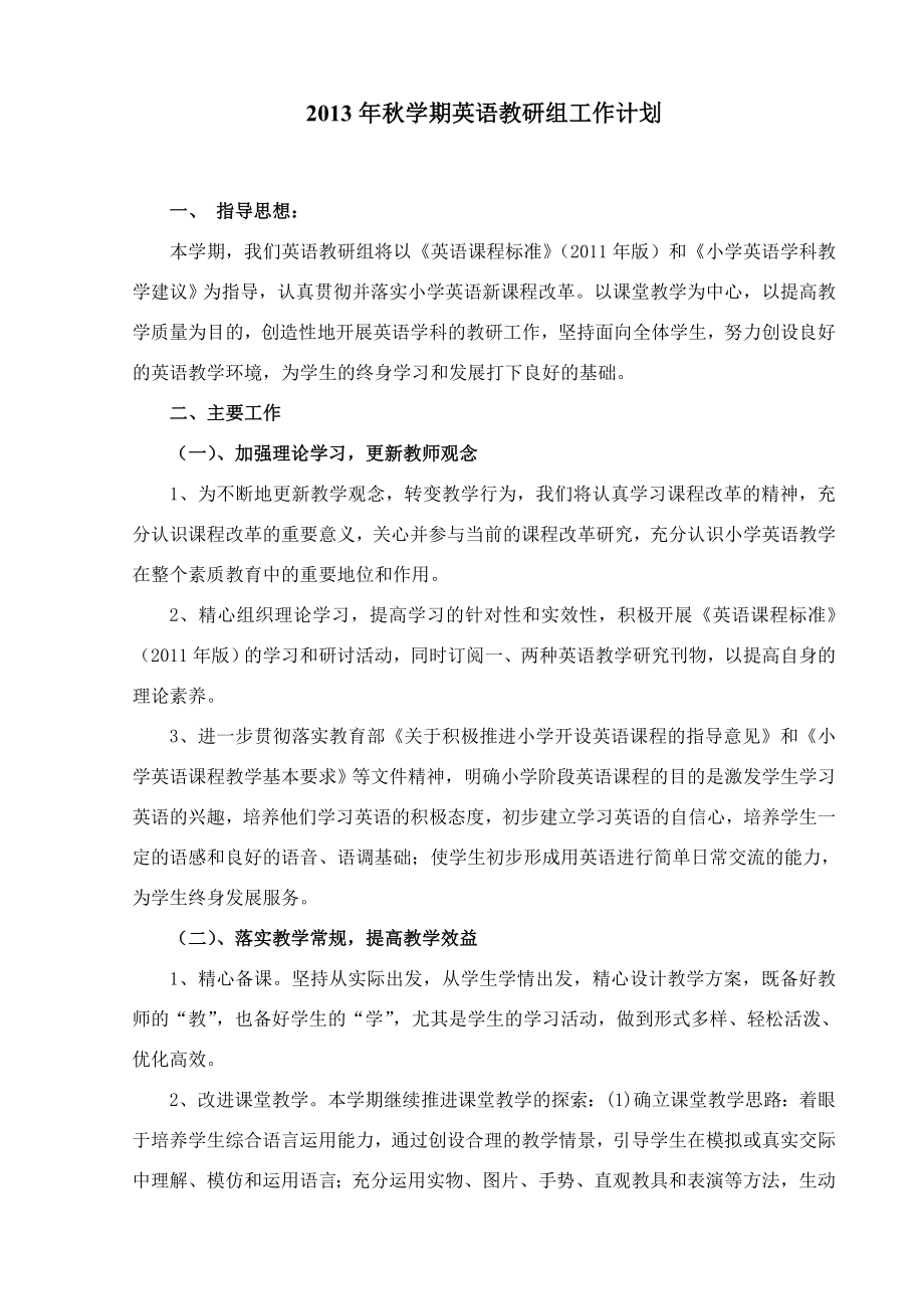 2013年秋学期英语教研组工作计划一、 指导思想:本学期,我们英语教研组将以《英语课程标准》(2011年版)和《小学英语学科教学建议》为指导,认真贯彻并落实小学英语新课程改革以课堂教学为中心,以提高教学质量为目的,创造性地开展英语学科的教研工作,坚持面向全体学生,努力创设良好的英语教学环境,为学生的终身学习和发展打下良好的基础 二、主要工作 (一)、加强理论学习,更新教师观念 1、为不断地更新教学观念,转变教学行为,我们将认真学习课程改革的精神,充分认识课程改革的重要意义,关心并参与当前的课程改革研究,充分认识小学英语教学在整个素质教育中的重要地位和作用 2、精心组织理论学习,提高学习的针对性和实效性,积极开展《英语课程标准》(2011年版)的学习和研讨活动,同时订阅一、两种英语教学研究刊物,以提高自身的理论素养 3、进一步贯彻落实教育部《关于积极推进小学开设英语课程的指导意见》和《小学英语课程教学基本要求》等文件精神,明确小学阶段英语课程的目的是激发学生学习英语的兴趣,培养他们学习英语的积极态度,初步建立学习英语的自信心,培养学生一定的语感和良好的语音、语调基础;使学生初步形成用英语进行简单日常交流的能力,为学生终身发展服务。