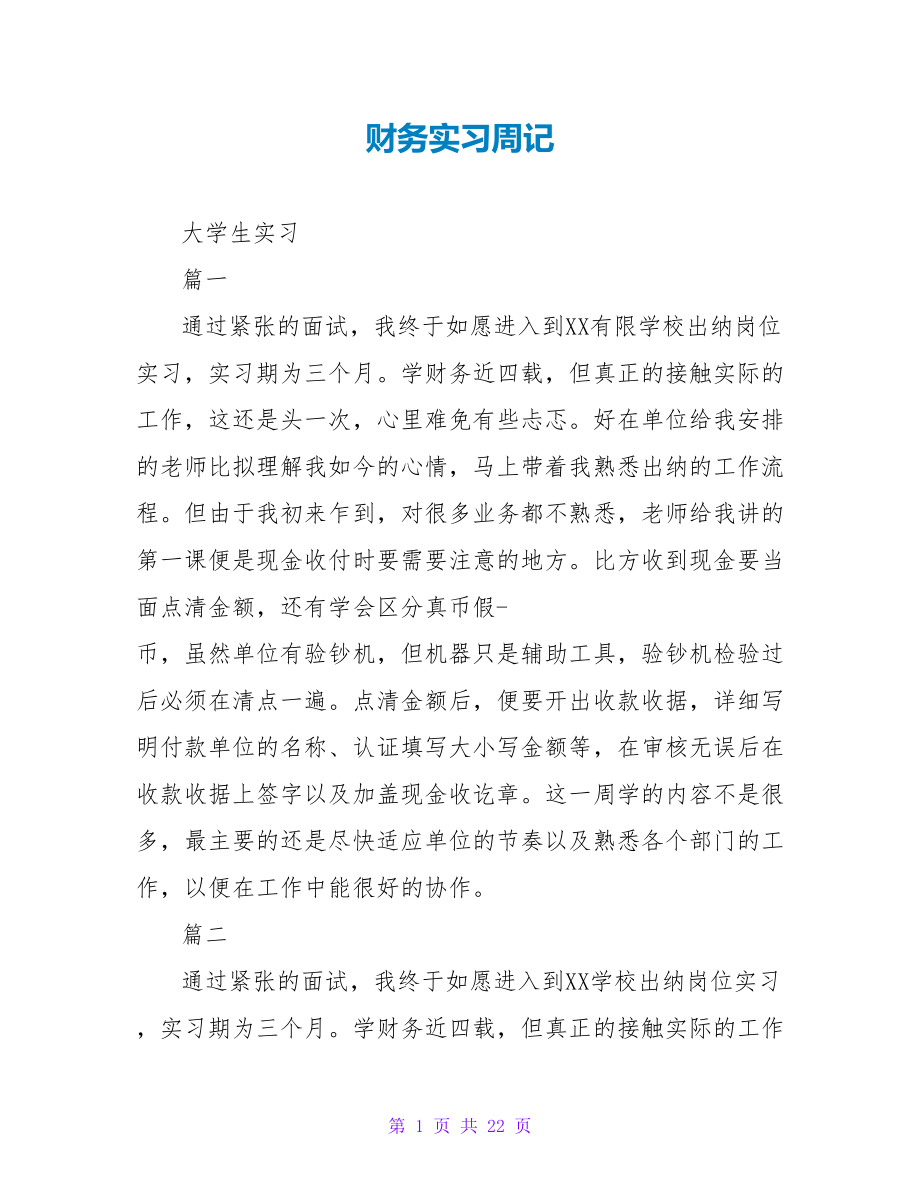 财务实习周记大学生实习篇一通过紧张的面试,我终于如愿进入到XX有限学校出纳岗位实习,实习期为三个月学财务近四载,但真正的接触实际的工作,这还是头一次,心里难免有些忐忑好在单位给我安排的老师比拟理解我如今的心情,马上带着我熟悉出纳的工作流程但由于我初来乍到,对很多业务都不熟悉,老师给我讲的第一课便是现金收付时要需要注意的地方比方收到现金要当面点清金额,还有学会区分真币假-币,虽然单位有验钞机,但机器只是辅助工具,验钞机检验过后必须在清点一遍点清金额后,便要开出收款收据,详细写明付款单位的名称、认证填写大小写金额等,在审核无误后在收款收据上签字以及加盖现金收讫章这一周学的内容不是很多,最主要的还是尽快适应单位的节奏以及熟悉各个部门的工作,以便在工作中能很好的协作篇二通过紧张的面试,我终于如愿进入到XX学校出纳岗位实习,实习期为三个月学财务近四载,但真正的接触实际的工作,这还是头一次,心里难免有些忐忑好在单位给我安排的老师比拟理解我如今的心情,马上带着我熟悉出纳的工作流程XX有限学校是一家以服装消费加工销售为一体的中韩合资企业,往来款项主要以电汇和承兑汇票为主,现金的收付较少但由于我初来乍到,对很多业务都不熟悉,老师给我讲的第一课便是现金收付时要需要注意的地方。