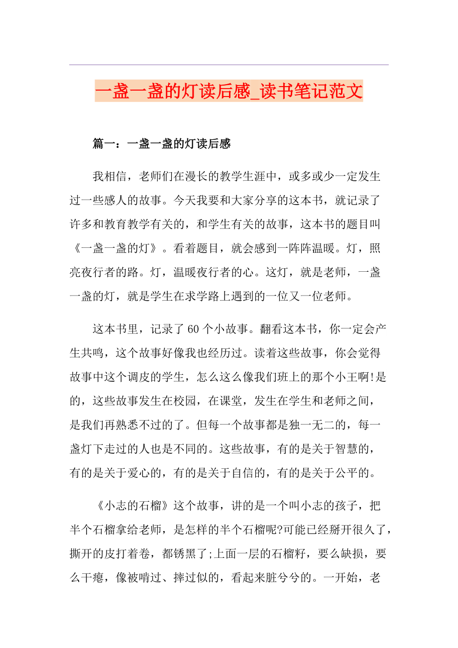 一盏一盏的灯读后感_读书笔记范文 篇一:一盏一盏的灯读后感 我相信,老师们在漫长的教学生涯中,或多或少一定发生过一些感人的故事今天我要和大家分享的这本书,就记录了许多和教育教学有关的,和学生有关的故事,这本书的题目叫《一盏一盏的灯》看着题目,就会感到一阵阵温暖灯,照亮夜行者的路灯,温暖夜行者的心这灯,就是老师,一盏一盏的灯,就是学生在求学路上遇到的一位又一位老师 这本书里,记录了60个小故事翻看这本书,你一定会产生共鸣,这个故事好像我也经历过读着这些故事,你会觉得故事中这个调皮的学生,怎么这么像我们班上的那个小王啊!是的,这些故事发生在校园,在课堂,发生在学生和老师之间,是我们再熟悉不过的了但每一个故事都是独一无二的,每一盏灯下走过的人也是不同的这些故事,有的是关于智慧的,有的是关于爱心的,有的是关于自信的,有的是关于公平的 《小志的石榴》这个故事,讲的是一个叫小志的孩子,把半个石榴拿给老师,是怎样的半个石榴呢?可能已经掰开很久了,撕开的皮打着卷,都锈黑了;上面一层的石榴籽,要么缺损,要么干瘪,像被啃过、摔过似的,看起来脏兮兮的一开始,老师不想要,就婉言谢绝了可这个孩子非常的固执,早上给了一次,午饭后又给,傍晚还给,老师终于明白,孩子捧给他的不仅仅是半个石榴,而是一颗鲜嫩纤弱的心。