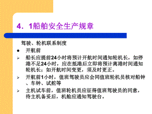 41船舶安全生产规章船舶安全生产规章 驾驶、轮机联系制度驾驶、轮机联系制度 l开航前开航前船长应提前船长应提前24小时将预计开航时间通知轮机长,如停小时将预计开航时间通知轮机长,如停港不足港不足24小时,应在抵港后立即将预计离港时间通知小时,应在抵港后立即将预计离港时间通知轮机长;如开航时间变更,须及时更正。轮机长;如开航时间变更,须及时更正。开航前开航前1小时,值班驾驶员应会同值班轮机员核对船钟小时,值班驾驶员应会同值班轮机员核对船钟、车钟、试舵等、车钟、试舵等主机试车前,值班轮机员应征得值班驾驶员的同意,主机试车前,值班轮机员应征得值班驾驶员的同意,待主机备妥后,机舱应通知驾驶台。待主机备妥后,机舱应通知驾驶台。41船舶安全生产规章船舶安全生产规章l航行中航行中每班下班前,值班轮机员应将主机平均转数和海水温度告知值班每班下班前,值班轮机员应将主机平均转数和海水温度告知值班驾驶员,值班驾驶员应回告本班平均航速和风向风力;每日中午驾驶员,值班驾驶员应回告本班平均航速和风向风力;每日中午,驾驶台和机舱校对时钟并互换正午报告。,驾驶台和机舱校对时钟并互换正午报告。船舶需备车航行时,驾驶台应提前通知机舱准备;如突发情况,船舶需备车航行时,驾驶台应提前通知机舱准备;如突发情况,值班轮机员接到通知后应尽快备妥主机;判断将有风暴来临时,值班轮机员接到通知后应尽快备妥主机;判断将有风暴来临时,船长应及时通知轮机长做好各种准备。船长应及时通知轮机长做好各种准备。须短时间抛锚时,值班驾驶员应将情况及时通知值班轮机员。须短时间抛锚时,值班驾驶员应将情况及时通知值班轮机员。停车应先征得船长同意,但若情况危急,不立即停车就会威胁主停车应先征得船长同意,但若情况危急,不立即停车就会威胁主机或人身安全时,轮机长可立即停车并通知驾驶台;机或人身安全时,轮机长可立即停车并通知驾驶台;轮机部如调换发电机、并车或暂时停电,应事先通知驾驶台。轮机部如调换发电机、并车或暂时停电,应事先通知驾驶台。应严格执行船长和轮机长共同商定的主机各种车速。应严格执行船长和轮机长共同商定的主机各种车速。船舶在到港前,应对主机进行停、倒车试验。船舶在到港前,应对主机进行停、倒车试验。41船舶安全生产规章船舶安全生产规章l靠泊中靠泊中抵港后,船长应告知轮机长本船的预计动态,以便安排工作;机抵港后,船长应告知轮机长本船的预计动态,以便安排工作;机舱若需检修影响动车的设备,轮机长应事先报告船长,取得同意舱若需检修影响动车的设备,轮机长应事先报告船长,取得同意后方可进行。后方可进行。值班驾驶员应将装卸货情况随时通知值班轮机员,以保证安全供值班驾驶员应将装卸货情况随时通知值班轮机员,以保证安全供电;在装卸重大件或特种危险品或使用重吊之前,大副应通知轮电;在装卸重大件或特种危险品或使用重吊之前,大副应通知轮机长派人检查起货机,必要时还应派人值守。机长派人检查起货机,必要时还应派人值守。如因装卸作业造成船舶过度倾斜,影响机舱正常工作时,轮机长如因装卸作业造成船舶过度倾斜,影响机舱正常工作时,轮机长应通知大副或值班驾驶员采取有效措施予以纠正。应通知大副或值班驾驶员采取有效措施予以纠正。对船舶压载的调整,驾驶和轮机部门应建立起有效的联系制度,对船舶压载的调整,驾驶和轮机部门应建立起有效的联系制度,包括书面通知和相应的记录。包括书面通知和相应的记录。每次填装燃油前,轮机长应将本船的存油情况和计划填装的油舱每次填装燃油前,轮机长应将本船的存油情况和计划填装的油舱和各舱填装的数量告知大副,以便计算稳性、水尺和调整吃水差和各舱填装的数量告知大副,以便计算稳性、水尺和调整吃水差。41船舶安全生产规章船舶安全生产规章l驾驶台规则驾驶台规则范围有操舵室和海图室,包括两翼甲板和标准罗经甲板;范围有操舵室和海图室,包括两翼甲板和标准罗经甲板;除船长和引航员外,任何人不得坐着值班,也不得在驾驶台用餐和除船长和引航员外,任何人不得坐着值班,也不得在驾驶台用餐和睡眠。睡眠。航行中每天由航行中每天由0408值班水手负责驾驶台内外清洁。值班水手负责驾驶台内外清洁。航行中,操舵室的门窗任何时候不可全部关闭。航行中,操舵室的门窗任何时候不可全部关闭。驾驶台各种物品,未经船长许可,不得任意销毁或携出驾驶台。驾驶台各种物品,未经船长许可,不得任意销毁或携出驾驶台。操舵室和标准罗经附近不可放置铁质或磁性物件。操舵室和标准罗经附近不可放置铁质或磁性物件。夜间航行时,严禁有碍正常航行和了望的灯光外露。夜间航行时,严禁有碍正常航行和了望的灯光外露。驾驶台无人值守时,二副应将可携带的贵重仪器和重要物品收藏柜驾驶台无人值守时,二副应将可携带的贵重仪器和重要物品收藏柜内并加锁,驾驶台所有门窗均应闭锁,未经船长批准,不准外人参内并加锁,驾驶台所有门窗均应闭锁,未经船长批准,不准外人参观;倘有外人参观或检修,应派专人陪同配合。观;倘有外人参观或检修,应派专人陪同配合。41船舶安全生产规章船舶安全生产规章l自动舵使用规定自动舵使