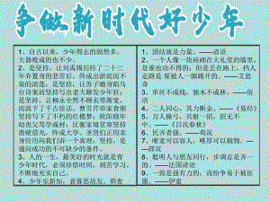 1、自古以来,少年得志的固然多,大器晚成的也不少。2、是坚持,让刘禹锡历经了二十三年弃置身的悲苦后,终成出淤泥而不染的清莲;是坚持,让苏子瞻身陷乌台诗案而坚持写出老夫聊发少年狂;是坚持。让柳永全然不顾衣带渐宽,而流下了千古佳话。曹雪芹举家食粥坚持写下了不朽的红楼梦;欧阳修年幼丧父笃学成材;匡衡家境贫寒坚持凿壁借光,终成大学。圣贤们正用亲身经历向我们诉一个真理:坚持,是通向成功的不可缺少的条件。3、人的一生,最美好的时光就是青少年时代,必须珍惜时间,刻苦学习,不断地充实自己。4、少年乐新知,衰暮思故友。韩愈1、团结就是力量。谚语2、一个人像一块砖砌在大礼堂的墙里,是谁也动不得的;但是丢在路上,挡人走路是 要被人一脚踢开的。艾思奇3、单丝不成线,独木不成林。俗语4、二人同心,其力断金。易经5、万人操弓,共射一招,招无不中。吕氏春秋6、民齐者强。荀况7、唯宽可以容人,唯厚可以载物。薛宣8、聪明人与朋友同行,步调总是齐一的。法国谚语9、一致是强有力的,而纷争易于被征服。伊索