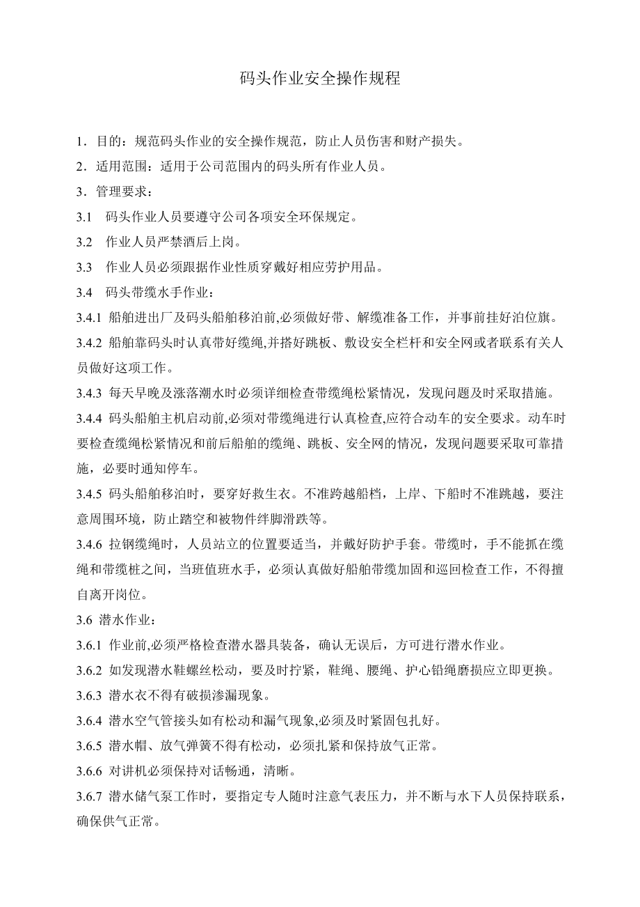码头作业安全操作规程1.目的:规范码头作业的安全操作规范,防止人员伤害和财产损失2.适用范围:适用于公司范围内的码头所有作业人员3.管理要求:3.1 码头作业人员要遵守公司各项安全环保规定3.2 作业人员严禁酒后上岗3.3 作业人员必须跟据作业性质穿戴好相应劳护用品3.4 码头带缆水手作业:3.4.1 船舶进出厂及码头船舶移泊前,必须做好带、解缆准备工作,并事前挂好泊位旗3.4.2 船舶靠码头时认真带好缆绳,并搭好跳板、敷设安全栏杆和安全网或者联系有关人员做好这项工作3.4.3 每天早晚及涨落潮水时必须详细检查带缆绳松紧情况,发现问题及时采取措施3.4.4 码头船舶主机启动前,必须对带缆绳进行认真检查,应符合动车的安全要求动车时要检查缆绳松紧情况和前后船舶的缆绳、跳板、安全网的情况,发现问题要采取可靠措施,必要时通知停车3.4.5 码头船舶移泊时,要穿好救生衣不准跨越船档,上岸、下船时不准跳越,要注意周围环境,防止踏空和被物件绊脚滑跌等3.4.6 拉钢缆绳时,人员站立的位置要适当,并戴好防护手套带缆时,手不能抓在缆绳和带缆桩之间,当班值班水手,必须认真做好船舶带缆加固和巡回检查工作,不得擅自离开岗位。