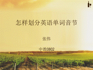怎样划分英语单词音节张伟中教0802 音节是听觉能感受到的最自然的语音单位,有一个或几个音素按一定规律组合而成。汉语中一个汉字就是一个音节,每个音节由声母、韵母和声调三个部分组成;英语中一个元音音素可构成一个音节,一个元音音素和一个或几个辅音音素结合也可以构成一个音节什么叫音节英语单词的构成 英语单词是由字母组成的,而字母又构成音节,音节的核心是元音,由一个或几个元音字母代表。根据单词所含的音节,把单词分为单音节词、双音节词和多音节词。下面给大家介绍几种如何划分音节的方法:(1)如果两个音节之间只有一个辅音字母(r除外),该字母要归右面的音节,第一音节要读作开音节。如paperpeip+,studentstju:d+nt,(2)如果两音节之间有两个辅音字母(第一个不是r),这两个辅音字母分别划归左右两个音节,第一个音节为闭音节。如:matterm$t+,windowwind+u,happyh$pi,mid-dle midl等。注:如果两个相同的辅音字母在一起并用时,只发一个辅音字母的音,如上例。2)如果两音节之间有两个辅音字母,第一个是r,好这两个辅音字母可分别划归左右两个音节,第一个音节按r重读音节读,如 cornerk&:Q+,certains+:tn等。如果分界线上的两个辅音字母都是r,左边的重读音节按闭音节读。如:car-ryk$ri,sorrys&ri,carrotk$r+t,borrowb&r+(等。(4)辅音字母l,m,n等也可构成非重读音节,如apple$pl,bottleb&tl,noodleQu:dl,often&fn等。以上所讲正是:每个音节一元音,并连辅音两边分,还有一点需注音,字母组合不能分,缺少元音无音节,不算几个成节音。如:(CSASDSKSKQHQLQ)如何划分音节 Students copy “音节划分”是拼读规则中的一个至关重要的内容,掌握它有利于拼读技能的落实。本节将用较长的篇幅讨论。双音节单词的音节划分方法可归纳为“两分手。一归前或一归后”。1.“两分手”是指:当两个元音之间有两个辅音字母时,将两个辅音字母划分 在前后两个音节里。具体细节以及读音特点,分别介绍如下:1a.当两个辅音字母相同(包括字母 r),且重读音节在词首时:。better 划分成 bet ter carry 划分成 car ry yellow 划分成 yel low borrow 划分成 bor row millet 划分成 mil let little 划分成 lit tle 第一个音节的元音按照“短元音”读,但是相邻的那一个辅音字母没有读音。注意:字 母 l,r在非重读音节中,有时起元音的作用。如在单词little,acre 中1b.带前缀的单词,有时也有两个相同的辅音字母(包括字母 r),如:attack划分成at tack arrive划分成 ar rive attend 划分成 at tend correct划分成 cor rect effect划分成 ef fect support划分成 sup port 这样的单词,第一个音节是“非重读音节”,元音一般读“含糊元音”。1c.当两个辅音字母不同(不包括字母 r)时:sister 划分成 sis ter window 划分成 win dow system 划分成 sys tem publish 划分成 pub lish milky 划分成 mil ky(建议将这个单词的读音与millet 的读音相比较。)第一个音节的元音按照“短元音”读,相邻的辅音字母有读音。1d.当两个辅音字母不同,并且第一个辅音字母为 r 时:market 划分成 mar ket dirty 划分成 dir ty certain 划分成 cer tain forty 划分成 for ty surface 划分成 sur face purple 划分成 pur ple 第一个音节的元音按照“第四类音节的读音”读。注意:不能够“两分手”的情况:a.辅音字符th,sh,ch,tch,ck等,是不允许分割的。这样的单词有:fa ther oth er cash ier ma chine pock et meth od moth er fash ion re charge butch er b.各种辅音连缀,如 cr,pr,bl,fl,等,也是不允许分割的。这样的单词有:April 只能划分成 A pril secret 只能划分成 se cret apron只能划分成 a pron sacred 只能划分成 sa cred 包括带前缀的一些单词,如 degree,decrease,across,agree,afraid 等。2.“一归前或一归后”是指:当两个元音之间只有一个辅音字母时,有时将这 个辅音字母划分在前面的音节里,有时划分在后面的音节里。2a.先说“一归后”的情况。在有些单词中是对的。如:open 划分成 o pen able 划分成 a ble even 划分成 e ven nation 划分成 na tion fever 划分成 fe ver unit 划分成 u nit tiny 划分成 ti ny student 划分成 stu dent 显然,第一个音节的元音按照“长元音”读。:2b.带有以元音结尾的前缀的单词,自然是属于“一归后”的。如 begin 划分成 be gin repeat 划分成 re peat decide 划分成 de cide return 划分成 re turn prepare 划分成pre pare repair 划分成 re pair 重读音节在第二个音节,其元音按照第二章中的诸多规则读音 2c.再看“一归前”的情况。在有些单词中也是对的。如:city 划分成 cit y minute 划分成 min ute study 划分成 stud y second 划分成 sec ond travel 划分成 trav el never 划分成 nev er 显然,第一个音节的元音按照“短元音”读。另外,字母 x 永远是划归第一个音节的。并且第一个音节读“短元音”。如:taxi划分成 tax i exit 划分成 ex it 鉴于“一归后”、“一归前”两种情况都存在,所以需要细致地对待这个口诀 谢谢观看