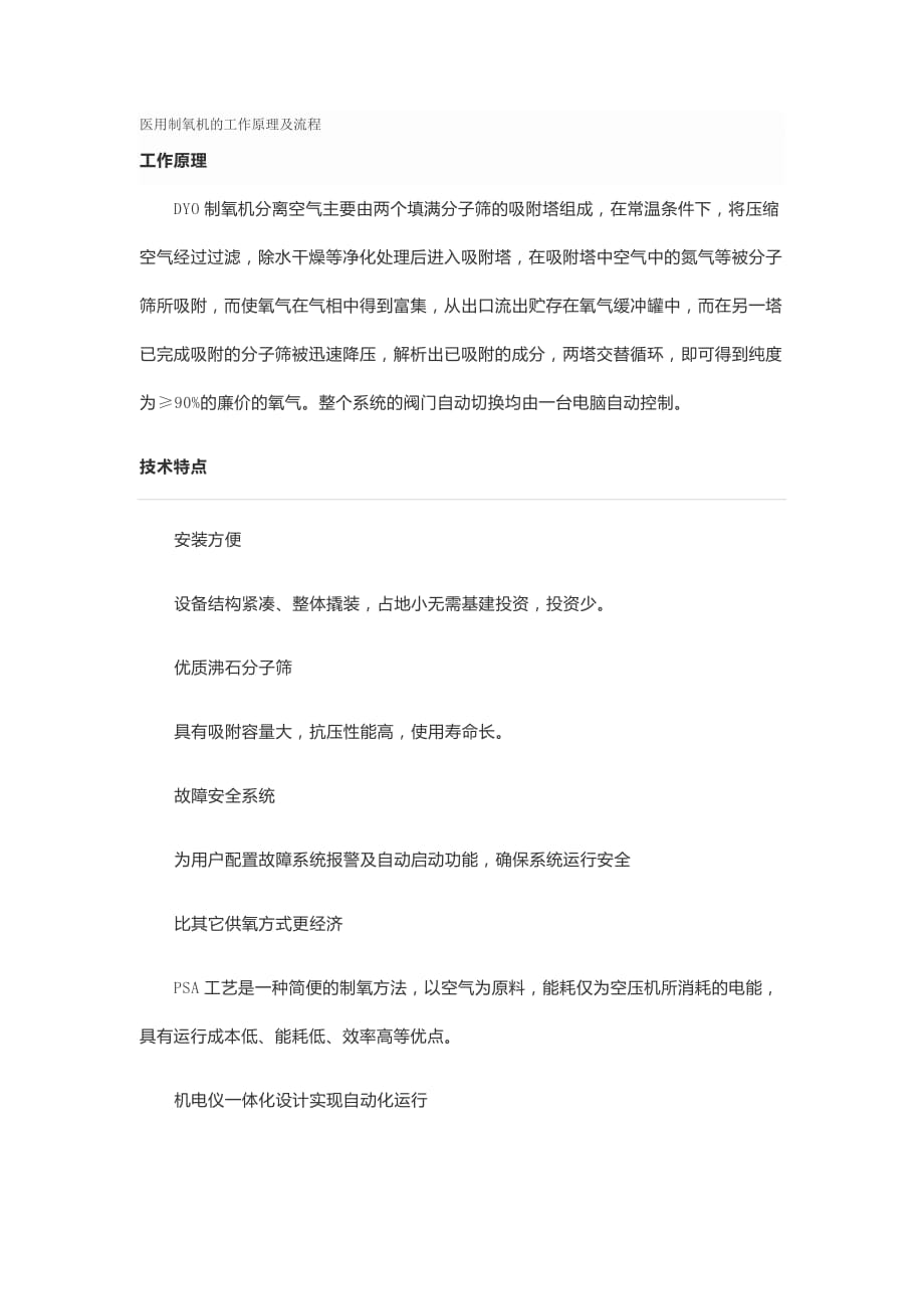 医用制氧机的工作原理及流程 工作原理 DYO制氧机分离空气主要由两个填满分子筛的吸附塔组成,在常温条件下,将压缩空气经过过滤,除水干燥等净化处理后进入吸附塔,在吸附塔中空气中的氮气等被分子筛所吸附,而使氧气在气相中得到富集,从出口流出贮存在氧气缓冲罐中,而在另一塔已完成吸附的分子筛被迅速降压,解析出已吸附的成分,两塔交替循环,即可得到纯度为≥90%的廉价的氧气整个系统的阀门自动切换均由一台电脑自动控制 技术特点 安装方便 设备结构紧凑、整体撬装,占地小无需基建投资,投资少 优质沸石分子筛 具有吸附容量大,抗压性能高,使用寿命长 故障安全系统 为用户配置故障系统报警及自动启动功能,确保系统运行安全 比其它供氧方式更经济 PSA工艺是一种简便的制氧方法,以空气为原料,能耗仅为空压机所消耗的电能,具有运行成本低、能耗低、效率高等优点 机电仪一体化设计实现自动化运行 进口PLC控制全自动运行氧气流量压力纯度可调并连续显示,可设定压力、流量、纯度报警并实现远程自动控制和检测计量,实现真正无人操作先进的控制系统使操作变得更加简单,可实现无人值守和远程控制,并可对各种工况进行实时监控,从而保证了气体纯度、流量的稳定。