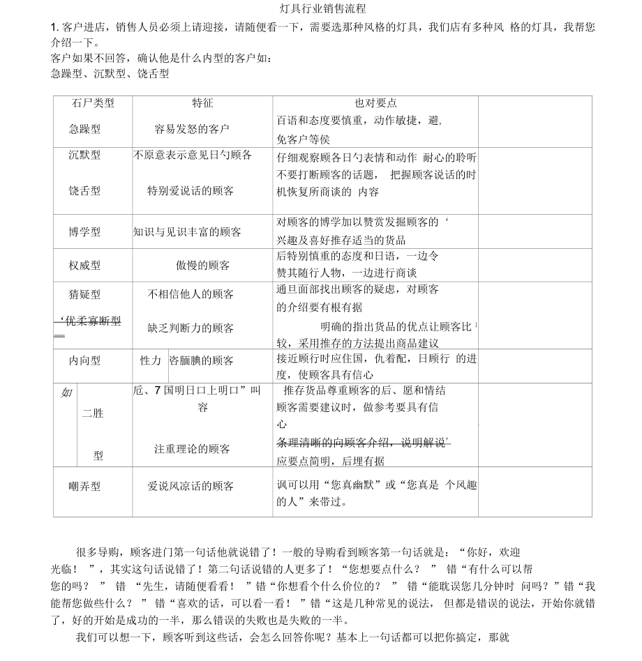 灯具行业销售流程1.客户进店,销售人员必须上请迎接,请随便看一下,需要选那种风格的灯具,我们店有多种风 格的灯具,我帮您介绍一下客户如果不回答,确认他是什么内型的客户如:急躁型、沉默型、饶舌型石尸类型急躁型特征容易发怒的客户也对要点百语和态度要慎重,动作敏捷,避,免客户等侯沉默型饶舌型不原意表示意见日勺顾各特别爱说话的顾客仔细观察顾各日勺表情和动作 耐心的聆听,不要打断顾客的话题, 把握顾客说话的时机恢复所商谈的 内容博学型知识与见识丰富的顾客对顾客的博学加以赞赏发掘顾客的‘兴趣及喜好推存适当的货品权威型傲慢的顾客后特别慎重的态度和日语,一边令赞其随行人物,一边进行商谈—、/、上、/ 、一 r r、“ r . n ,、」rj一 r n ,、'J猜疑型‘优柔寡断型—不相信他人的顾客缺乏判断力的顾客通旦面部找出顾客的疑虑,对顾客的介绍要有根有据明确的指出货品的优点让顾客比1较,采用推存的方法提出商品建议内向型性力咨腼腆的顾客接近顾行时应住国,仇着配,日顾行 的进度,使顾客具有信心如二胜型 卮、7国明日口上明口”叫容注重理论的顾客推存货品尊重顾客的后、愿和情结顾客需要建议时,做参考要具有信心条理清晰的向顾客介绍,说明解说'应要点简明,后埋有据1嘲弄型爱说风凉话的顾客讽可以用“您真幽默”或“您真是 个风趣的人”来带过。