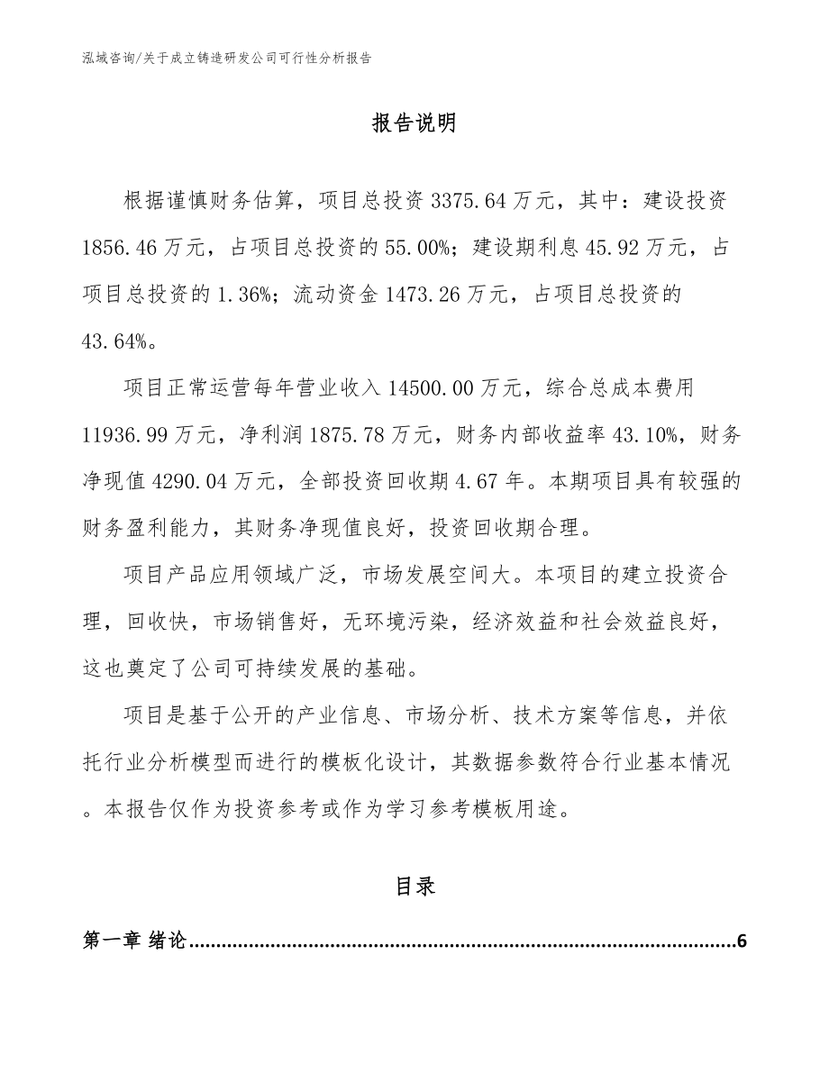 泓域咨询/关于成立铸造研发公司可行性分析报告报告说明根据谨慎财务估算,项目总投资3375.64万元,其中:建设投资1856.46万元,占项目总投资的55.00%;建设期利息45.92万元,占项目总投资的1.36%;流动资金1473.26万元,占项目总投资的43.64%项目正常运营每年营业收入14500.00万元,综合总成本费用11936.99万元,净利润1875.78万元,财务内部收益率43.10%,财务净现值4290.04万元,全部投资回收期4.67年本期项目具有较强的财务盈利能力,其财务净现值良好,投资回收期合理项目产品应用领域广泛,市场发展空间大本项目的建立投资合理,回收快,市场销售好,无环境污染,经济效益和社会效益良好,这也奠定了公司可持续发展的基础项目是基于公开的产业信息、市场分析、技术方案等信息,并依托行业分析模型而进行的模板化设计,其数据参数符合行业基本情况本报告仅作为投资参考或作为学习参考模板用途目录第一章 绪论 6一、 项目名称及建设性质 6二、 项目承办单位 6三、 项目定位及建设理由 6四、 项目建设选址 8五、 项目总投资及资金构成 8六、 资金筹措方案 9七、 项目预期经济效益规划目标 9八、 项目建设进度规划 9九、 项目综合评价 9主要经济指标一览表 10第二章 市场营销 12一、 中国铸造行业发展情况 12二、 营销活动与营销环境 13三、 铸造行业面临的挑战 15四、 以消费者为中心的观念 16五、 螺杆转子市场情况 17六、 关系营销的主要目标 19七、 铸造行业概况 20八、 品牌组合与品牌族谱 20九、 球墨铸铁概述 26十、 整合营销传播计划过程 27十一、 铸造工艺概述 27十二、 营销计划的实施 28第三章 人力资源方案 31一、 绩效指标体系的设计要求 31二、 企业人员配置的基本方法 32三、 薪酬管理制度 34四、 员工福利计划 36五、 基于不同维度的绩效考评指标设计 39六、 培训课程设计的基本原则 43第四章 经营战略分析 46一、 企业文化的基本内容 46二、 融合战略的构成要件 50三、 企业市场细分 53四、 企业品牌战略的管理方法 58五、 企业使命决策应考虑的因素和重要问题 59六、 战略经营领域结构 62七、 融资战略决策遵循的原则 63第五章 SWOT分析 66一、 优势分析(S) 66二、 劣势分析(W) 67三、 机会分析(O) 68四、 威胁分析(T) 68第六章 选址可行性分析 72一、 强化空间管控,优化全域发展格局 77二、 提升产业层次,构建现代产业体系 79第七章 项目投资计划 83一、 建设投资估算 83建设投资估算表 84二、 建设期利息 84建设期利息估算表 85三、 流动资金 86流动资金估算表 86四、 项目总投资 87总投资及构成一览表 87五、 资金筹措与投资计划 88项目投资计划与资金筹措一览表 88第八章 项目经济效益分析 90一、 经济评价财务测算 90营业收入、税金及附加和增值税估算表 90综合总成本费用估算表 91利润及利润分配表 93二、 项目盈利能力分析 94项目投资现金流量表 95三、 财务生存能力分析 97四、 偿债能力分析 97借款还本付息计划表 98五、 经济评价结论 99第九章 财务管理方案 100一、 财务管理的内容 100二、 计划与预算 102三、 企业财务管理体制的设计原则 104四、 资本成本 108五、 对外投资的影响因素研究 116六、 存货成本 119第十章 项目总结分析 121第一章 绪论一、 项目名称及建设性质(一)项目名称关于成立铸造研发公司(二)项目建设性质本项目属于扩建项目二、 项目承办单位(一)项目承办单位名称xx有限责任公司(二)项目联系人吴xx三、 项目定位及建设理由“十四五”时期,世界百年未有之大变局加速演变和我国建设社会主义现代化国家新征程开局起步相互交融,与全国、全省、全市一样仍然处于重要战略机遇期,但机遇和挑战都有新的发展变化,需要仪征准确把握新阶段、贯彻新理念、融入新格局,实现新发展。
