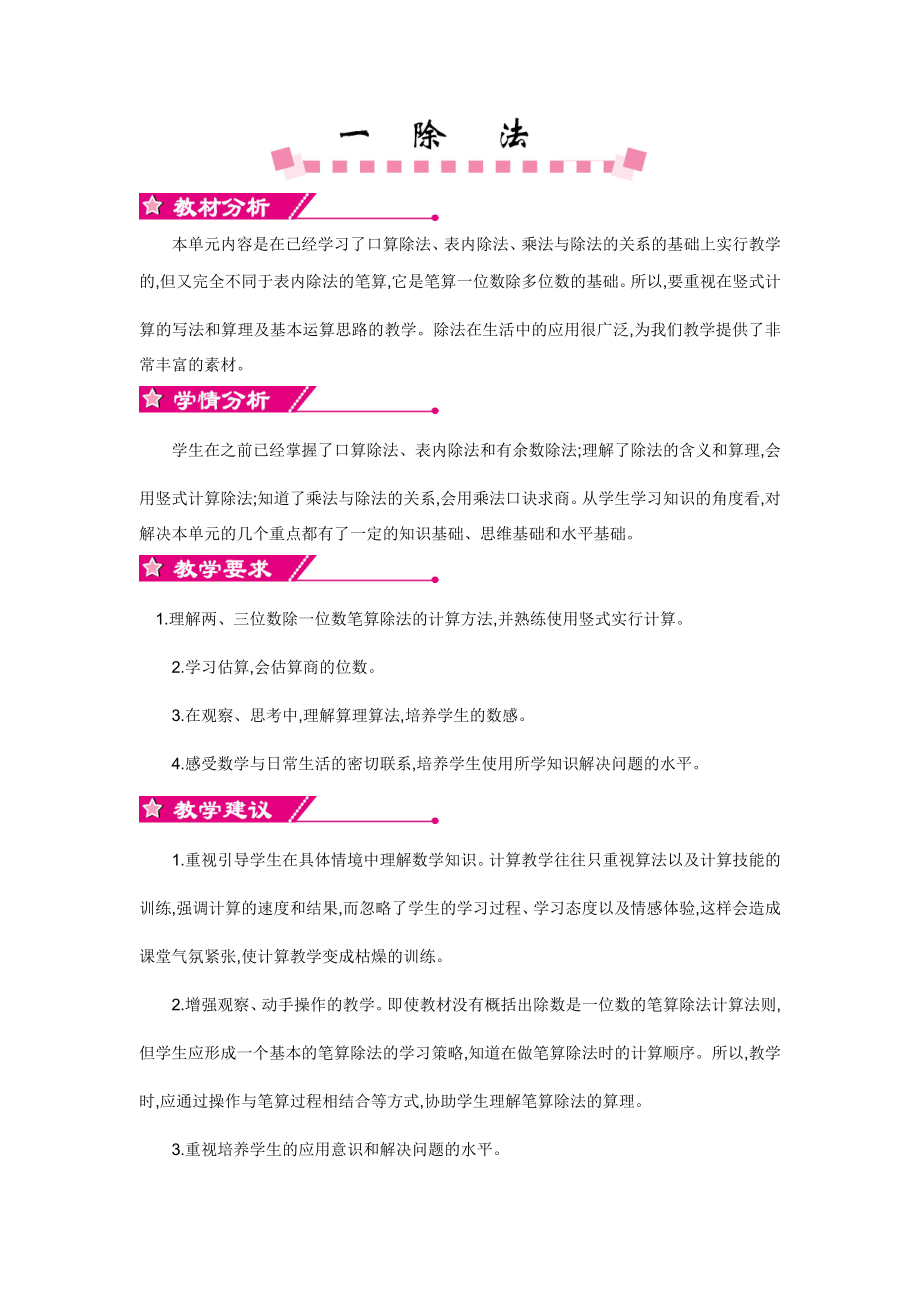 本单元内容是在已经学习了口算除法、表内除法、乘法与除法的关系的基础上实行教学的,但又完全不同于表内除法的笔算,它是笔算一位数除多位数的基础所以,要重视在竖式计算的写法和算理及基本运算思路的教学除法在生活中的应用很广泛,为我们教学提供了非常丰富的素材学生在之前已经掌握了口算除法、表内除法和有余数除法;理解了除法的含义和算理,会用竖式计算除法;知道了乘法与除法的关系,会用乘法口诀求商从学生学习知识的角度看,对解决本单元的几个重点都有了一定的知识基础、思维基础和水平基础 1.理解两、三位数除一位数笔算除法的计算方法,并熟练使用竖式实行计算2.学习估算,会估算商的位数3.在观察、思考中,理解算理算法,培养学生的数感4.感受数学与日常生活的密切联系,培养学生使用所学知识解决问题的水平1.重视引导学生在具体情境中理解数学知识计算教学往往只重视算法以及计算技能的训练,强调计算的速度和结果,而忽略了学生的学习过程、学习态度以及情感体验,这样会造成课堂气氛紧张,使计算教学变成枯燥的训练2.增强观察、动手操作的教学即使教材没有概括出除数是一位数的笔算除法计算法则,但学生应形成一个基本的笔算除法的学习策略,知道在做笔算除法时的计算顺序。