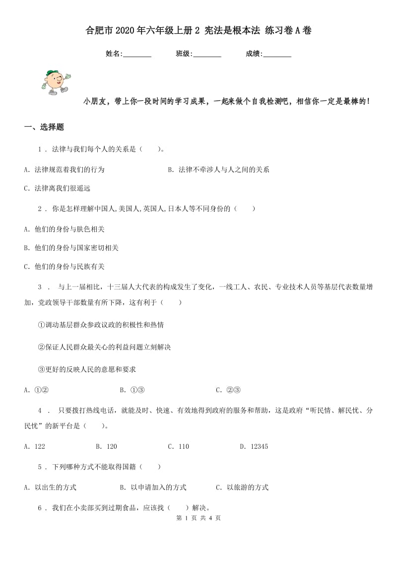 合肥市2020年六年级上册2 宪法是根本法 练习卷A卷姓名:________ 班级:________ 成绩:________ 小朋友,带上你一段时间的学习成果,一起来做个自我检测吧,相信你一定是最棒的!一、选择题1 . 法律与我们每个人的关系是( )A.法律规范着我们的行为B.法律不牵涉人与人之间的关系C.法律离我们很遥远2 . 你是怎样理解中国人,美国人,英国人,日本人等不同身份的( )A.他们的身份与肤色相关B.他们的身份与国家密切相关C.他们的身份与民族有关3 . 与上一届相比,十三届人大代表的构成发生了变化,一线工人、农民、专业技术人员等基层代表数量增加,党政领导干部数量有所下降,这有利于( )①调动基层群众参政议政的积极性和热情②保证人民群众最关心的利益问题立刻解决③更好的反映人民的意愿和要求A.①②B.①③C.②③4 . 只要拨打热线,就能及时、快速、有效地得到政府的服务和帮助,这是政府“听民情、解民忧、分民忧”的新平台是( )A.122B.120C.110D.123455 . 下列哪种方式不能取得国籍( )A.以出生的方式B.以申请加入的方式C.以旅游的方式6 . 我们在小卖部买到过期食品,应该找( )解决。