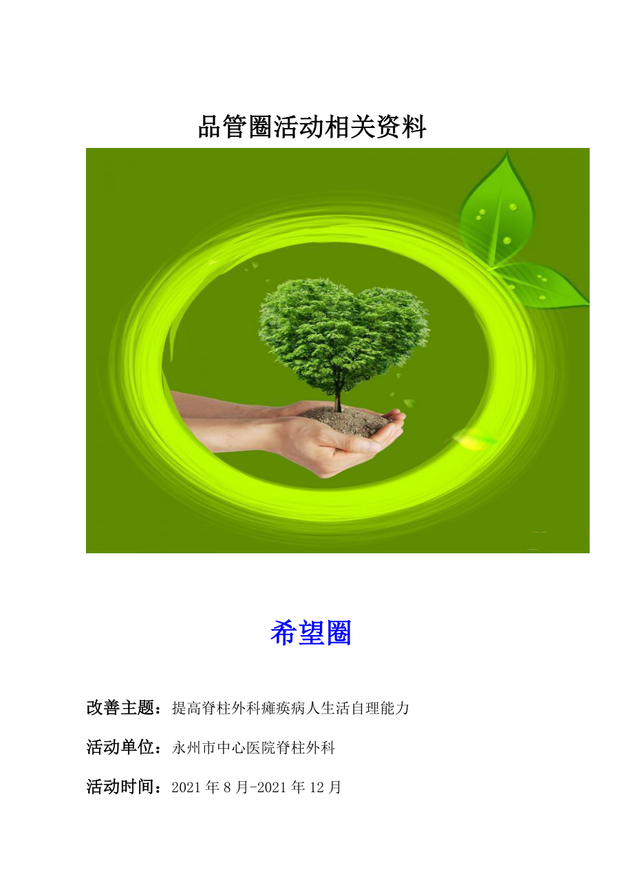 品管圈活动相关资料 希望圈改善主题:提高脊柱外科瘫痪病人生活自理能力活动单位:永州市中心医院脊柱外科活动时间:2021年8月-2021年12月一、圈的介绍〔一〕圈的组成圈 名:希望圈成立日期:2021年8月成员人数:9人平均年龄:23圈 长:唐风华辅 导 员:宋丽平副圈长:汪春莉圈成员及分工姓名分 工汪春莉数据收集肖 叶担任圈会记录工作屈 慧资料收集杨景华资料收集王凌萍资料收集王袁伊娜图表绘制陈思思图表绘制王素素图表绘制二、 圈名口号 阳光唤醒生命,双手托起太阳 团结赢得希望,希望铸造成就三、圈名的意义 希望圈:给在瘫痪病人中的人们带来的无限希望 寓意在我们的精心护理下病人对战胜疾病充满信心,对疾病的愈后充满希望,同时也寓意我们的护理品质在持续质量改良中不断的提升,我们的护理前景充满希望四、圈徽的组成2.绿色代表了生长、进取、希望、成功3.土壤代表医生,双手代表护士,小树代表患者,在医护共同的精心护理下,使原本绝望的,对生活失去信心的瘫痪患者重拾对生活的希望4.小树也代表脊柱外科,希望在我们的共同努力下成为一棵苍天大树五.圈徽的意义 护理的理念是“以病人为中心〞,把瘫痪患者真正的放入到我们每一位护理人员的心里,用我们的天使之翼托起病患的希望,用我们的爱心、细心、耐心、责任心感动病患,促进康复,表达人文关心和生命的价值,从而实现护理品质的提升。
