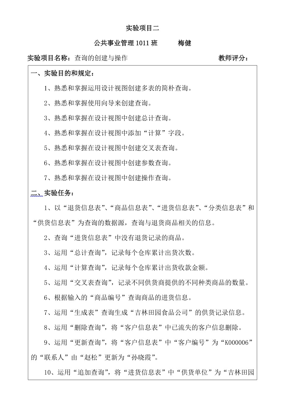 实验项目二公共事业管理1011班 梅健 实验项目名称:查询的创建与操作 教师评分:一、实验目的和规定:1、熟悉和掌握运用设计视图创建多表的简朴查询2、熟悉和掌握使用向导来创建查询3、熟悉和掌握在设计视图中创建总计查询4、熟悉和掌握在设计视图中添加“计算”字段5、熟悉和掌握在设计视图中创建交叉表查询6、熟悉和掌握在设计视图中创建参数查询7、熟悉和掌握在设计视图中创建操作查询二、实验任务:1、以“退货信息表”、“商品信息表”、“进货信息表”、“分类信息表”和“供货信息表”为查询的数据源,查询与退货商品相关的信息2、查询“进货信息表”中没有退货记录的商品3、运用“总计查询”,记录每个仓库累计出货次数4、运用“计算查询”,记录每个仓库累计出货收款金额5、运用“交叉表查询”,记录不同供货商提供的不同种类商品的数量6、根据输入的“商品编号”查询商品的进货信息7、运用“生成表”查询生成“吉林田园食品公司”的供货记录信息8、运用“删除查询”,将“客户信息表”中已流失的客户信息删除9、运用“更新查询”,将“客户信息表”中“客户编号”为“K000006”的“联系人”由“赵松”更新为“孙晓霞”。