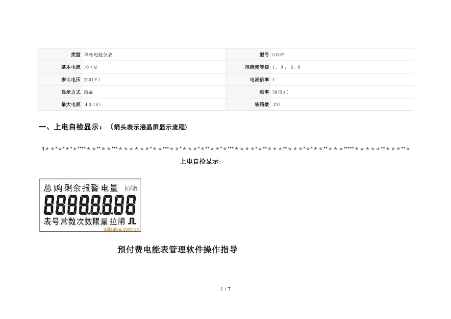 类型单相电能仪表型号DDSY基本电流10(A) 准确度等级10,2.0参比电压220(V) 电流倍率4显示方式液晶频率50(Hz) 最大电流40(A) 装箱数20一、上电自检显示:(箭头表示液晶屏显示流程) 1********************************************************************************************** 上电自检显示: 预付费电能表管理软件操作指导本文共三章主要针对初学者能快速熟练使用本软件所编辑的简要操作流程指导和常见操作问题处理,具体详细操作内容请进入系统后参考帮助信息栏里的帮助目录和使用手册本文件最终解释权归第一章 使用操作流程 软件安装 软件注册和人员电价设置 开户 售电 以后都是售电一、软件安装流程及说明 打开安装文件 点击“下一步” 点击“下一步” 输入密码888615后点击“下一步" 点击“浏览”选择安装路径为D盘或其他非系统盘(请勿安装在电脑操作系统盘,以免电脑中毒系统重装造成数据丢失)再一直点击“下一步”到完成.二、软件使用注册和功能设置 打开系统:输入密码800001(初始密码为编号)左键单击“确定”跳出窗口提示“系统还没注册~~~~"单击“确定”后自动跳转到“注册授权”注:软件使用前必须注册,也可在“设置维护"项里点击“系统设置维护”打开“注册授权"界面面 注册信息设置:收费站编号为“0",收费站名称根据自己情况填写,管理单位名称根据自己情况填写,系统注册编码可填六位数字(系统注册信息为软件对电表的识别身份信息非常重要,要求用户把注册信息记录下来永久保存),数据库路径和数据库备份路径可为系统检测到的默认路径无需更改,填写完整后单击上面的“保存注册设置”,窗口提示系统注册清空数据库,点击“确定”(系统投入使用后禁止修改注册信息否则会造成电表无法正常使用)系统选项设置:点击注册授权旁边的“系统选项”,建议把报警方式改为“固定电量”以下蓝框内信息可双击修改为10度(其他建议保持默认),囤积电量可根据自己要求可修改为更高99999(具体说明请参考帮助信息栏的使用手册和帮助目录),连接好读卡器并打开读卡器开关再在窗口选者连接串口(如COM1、COM2~~)并测试端口直到检测到有读写设备后点击上面“保存系统设置选项”打印发票设置:点击系统选项旁边的“发票设置”,点击“选择"可在DATA文件夹下的GDFP文件夹下找到三种发票格式选择自己需求选择任意一种再点击“保存发票设置”,如无要求可不设置操作人员设置:点击上方“人员设置”(也可在“设置维护”项里点击“人员电价设置”来打开“操作人员”窗口,增加操作人员:点击“增加”在编号处填入六为数字,填写好姓名,密码不用填写默认为编号可填可不填,在右边选择好权限(要求主管权限在所有功能前打√,普通售电员在营业售电和查询数据打√,工程人员在表计管理打√根据需求也可增加查询数据项目),输入完成后点上面“保存” 注:操作人员帐号必须在管理人员权限下修改、增加和删除,不能删除系统默认的管理员但可更改其密码。