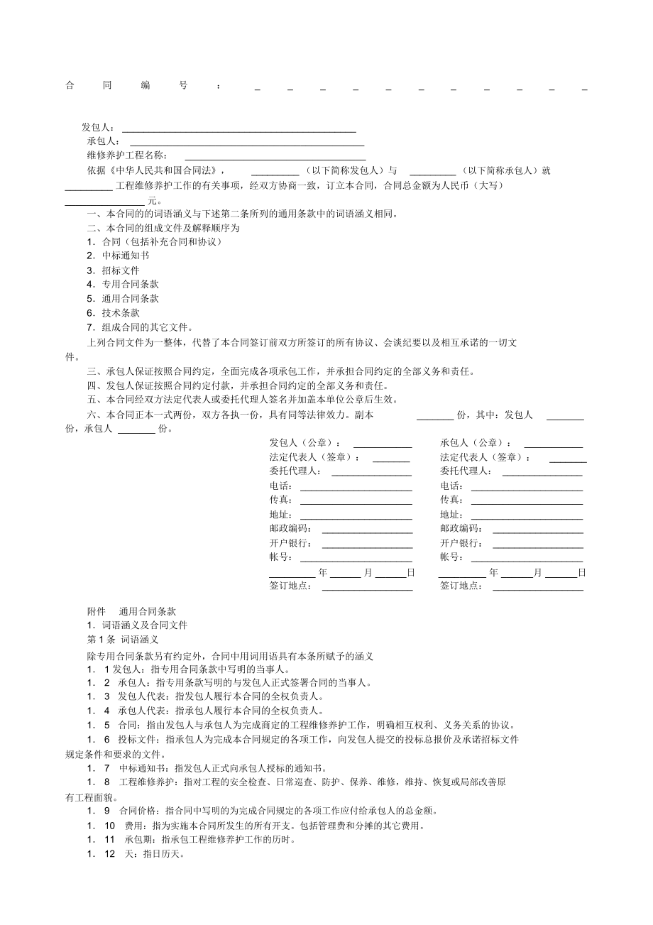 灾害继续发生,承包人应每隔2 天向发包人报告一次灾害情况,直到灾害结束发包人应对灾害处理提供必要条件第 30条因灾害发生的费用按下列规定由双方分别承担30. 1工程本身的损害由发包人承担30. 2人员伤亡由其所属方负责,并承担相应费用30. 3造成承包人设备、机械的损坏等损失,由承包人承担30. 4所需清理修复工作的费用由发包人承担第 31 条 合同的生效与终止本合同自发包人和承包人的法定代表人或其授权代表在合同书上签字并盖公章后生效承包期满,维修养护工作终止,未完承包工作内容按专用条款约定的方式处理后,并且除此之外合同双方均未遗留按合同规定应履行的其他义务时,合同自然终止专用合同条款前言专用合同条款中的各条款是补充和修改通用合同条款号相同的条款或当需要时增加新的条款,两者应对照阅读一旦出现矛盾或不一致,则以专用合同条款为准,通用合同条款中未补充和修改的部分仍有效1.词语涵义及合同条件第1条 词语涵义1. 1 发包人: _____________________________________________1. 2 承包人: _____________________________________________1. 3 发包人代表: _________________________________________1. 4 承包人代表 ___________________________________________1. 5 承包期:自 _______ 年______月 ______ 日开始,至 _______ 年 ______月 ______日终止。