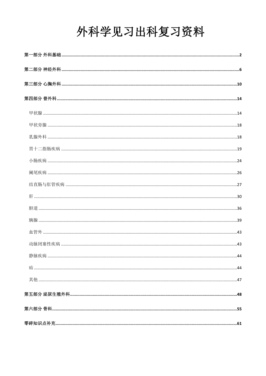 外科学见习出科复习资料第一部分 外科基础 2第二部分 神经外科 6第三部分 心胸外科 10第四部分 普外科 14甲状腺 14甲状旁腺 18乳腺外科 18胃十二指肠疾病 19小肠疾病 24阑尾疾病 26结直肠与肛管疾病 27肝 30胆道 36胰腺 39血管外 43动脉闭塞性疾病 43静脉疾病 44疝 44其他 47第五部分 泌尿生殖外科 48第六部分 骨科 55零碎知识点补充 61第一部分 外科基础围术期解决l 术前常规12小时禁食,4小时禁水l 外科手术按性质分为急诊手术,限期手术,择期手术l 初期完全缝合的切口分为三类I 类清洁切口:无菌切口,如甲状腺大部切除、疝修补术;II 类也许污染的切口:手术时也许带有污染的切口,如胃大部切除术、胆囊切除术;或皮肤不容易彻底灭菌的部位、6hrs内的伤口通过清创后缝合、新缝合的切口再度切开者III 类污染切口:邻近感染区或组织直接暴露于感染区的切口,如阑尾穿孔切除术、肠梗阻肠坏死手术等l 切口愈合:甲级:愈合优良、无不良反映;乙级:愈合处有炎症反映,如红肿、硬结、血肿、积液等,但未化脓;丙级:切口化脓,需切开引流l 拆线:头面颈4-5天下腹部、会阴部6-7天胸部、上腹部、背部、臀部7-9天,四肢10-12天减张缝线14天水电解质和酸碱平衡失调l 低渗性缺水(慢性缺水,继发性缺水)水和钠同时缺失,但失钠多于失水,故血清钠低于正常范围(<135mmol/L),细胞外液呈低渗状态。