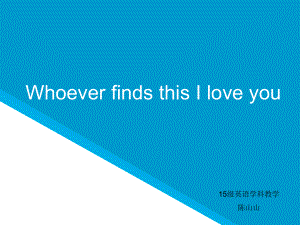 Whoever finds this I love you 15级英语学科教学陈山山Step 1 Lead in Look at pictures&brainstormingListen to the song&guess the plotKey words and phrases:a little old manwalk aloneorphan,little girl friend laughed a lotnever coming backStep 2 Listening and gap-fillingListen again&try to complete the missing words/phrasesQuestionsStep 3 Skimming and Scanning Read the text quickly to get the gist of the text what are the characteristics of the story?What are the time and place of the story happened?What did they do in the story?What are the climax and ending of the story?Locate the specific information and answer the following questions(5min)Step 4 Role plan Class viewing/Demonstration Define the roles and set up goalsRole play in groupsDiscuss the pairing/grouping1:)Have a discussion with your group members and try to rewrite the ending of the story with your imagination.2:)Submit your writing tomorrow.Step 5 Homework 谢谢观赏