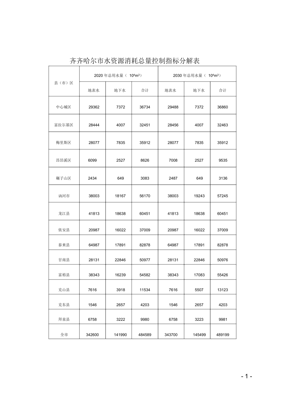 齐齐哈尔市水资源消耗总量控制指标分解表2020 年总用水量( 104m3)2030 年总用水量( 104m3)县(市)区地表水地下水合计地表水地下水合计中心城区2936273723673429488737236860富拉尔基区2844440073245128456400732463梅里斯区2807778353591228077783535912昂昂溪区609925278626700825279535碾子山区2434649308324876493136讷河市380031816756170380031924357245龙江县418131863860451418131863860451依安县209871602237009209871602237009泰来县649871789182878649871789182878甘南县281312284650977281312284650976富裕县383431623954582383431708355426克山县76163918115347616550713123克东县154626574203154626574203拜泉县675832229980675832239981全市342600141990484589343700145499489199- 1 -。