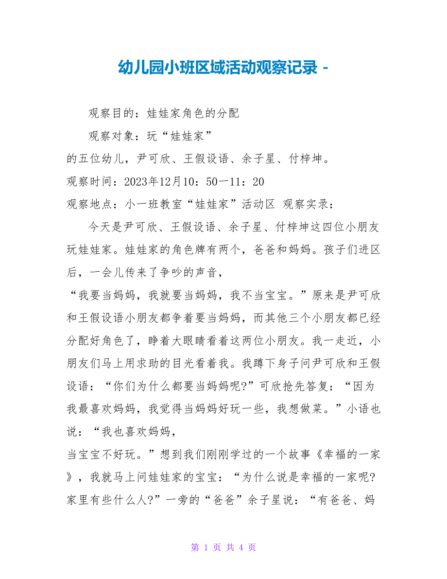 幼儿园小班区域活动观察记录 - 观察目的:娃娃家角色的分配 观察对象:玩“娃娃家” 的五位幼儿,尹可欣、王假设语、余子星、付梓坤 观察时间:2023年12月10:50一11:20 观察地点:小一班教室“娃娃家”活动区 观察实录: 今天是尹可欣、王假设语、余子星、付梓坤这四位小朋友玩娃娃家娃娃家的角色牌有两个,爸爸和妈妈孩子们进区后,一会儿传来了争吵的声音, “我要当妈妈,我就要当妈妈,我不当宝宝原来是尹可欣和王假设语小朋友都争着要当妈妈,而其他三个小朋友都已经分配好角色了,睁着大眼睛看着这两位小朋友我一走近,小朋友们马上用求助的目光看着我我蹲下身子问尹可欣和王假设语:“你们为什么都要当妈妈呢?”可欣抢先答复:“因为我最喜欢妈妈,我觉得当妈妈好玩一些,我想做菜小语也说:“我也喜欢妈妈, 当宝宝不好玩想到我们刚刚学过的一个故事《幸福的一家》,我就马上问娃娃家的宝宝:“为什么说是幸福的一家呢?家里有些什么人?”一旁的“爸爸”余子星说:“有爸爸、妈妈和哥哥 “哥哥”坤坤也在一边补充道:“家里还有宝宝呀!”我接着说:“对啦!我们一家人在一起很幸福,是因为我们有一大家的人,大家在一起相亲相爱!”可欣点点头说:“我也觉得,我们家也是这样的。