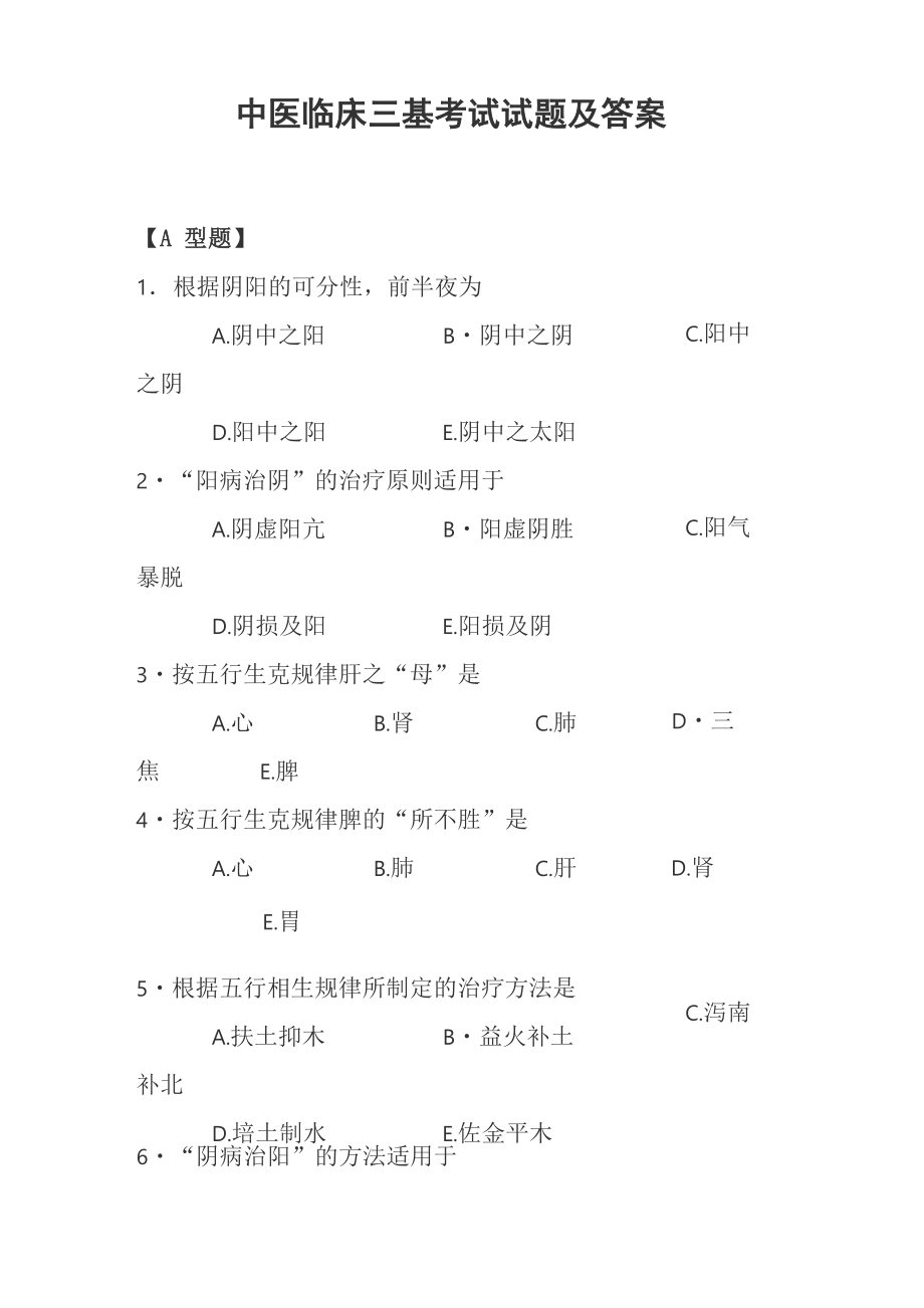 中医临床三基考试试题及答案【A 型题】 1.根据阴阳的可分性,前半夜为A.阴中之阳 B・阴中之阴之阴D.阳中之阳 E.阴中之太阳2・“阳病治阴”的治疗原则适用于A.阴虚阳亢 B・阳虚阴胜暴脱D.阴损及阳 E.阳损及阴3・按五行生克规律肝之“母”是A.心 B.肾 C.肺焦 E.脾4・按五行生克规律脾的“所不胜”是A.心 B.肺 C.肝E.胃5・根据五行相生规律所制定的治疗方法是A.扶土抑木 B・益火补土补北D.培土制水 E.佐金平木C.阳中C.阳气D・三D.肾C.泻南6・“阴病治阳”的方法适用于D.阴偏衰E.阴阳两虚A.脾D・肾7・“胃之关”是指B・肛门E・贲门8.“太仓”是指A.脾 B.大肠 C.六腑 D.小肠 E.胃9・被称为“仓廪之官”的是A.心 B.脾胃 C.膀胱 D.胃 E.小肠10・脾统血作用的实现,实际上是取决于A.脾阳温煦 B.气的固摄 C.饮食质量 D.脉道约束 E.血量充盈11・心主神志的物质基础是A.津液 B.精髓 C.血液 D.宗E・元气12・“心为五脏六腑之大主”,是因为A.心为阳脏 B.心主血脉 C.心主神志 D.心脉相连 E.心志为喜13・思为脾之志,但还与何脏相关E.心包14.肝主疏泄,最主要的关系是A.气机调畅 B・血液运行 C.津液代谢 D.情志活动 E.消化机能15・人体生命活动的原动力是指A.先天之精气 B・后天之谷气 C.宗气 D.元气 E.卫气16・中焦的功能特点可概括为A.如衡 B.如雾 C. 如沤 D.如露 E.如渎17・女子胞的生理主要与下列哪些脏腑关系最密切A.肾、心、肝、脾 B.心、肺、肝、肾 C脾、胃、心、肝D.肺、脾、肾、胃 E.肺、脾、心、胃18・泄泻初期采用“利小便而实大便”方法的根据是A.小肠主分清别浊 B・大肠主传导糟粕 C.膀胱主存泄小便D・小肠主受盛化物 E.胃气主通降下行19・具有协调气机升降关系的两脏是A.肺与-肾 B・肾与肝 C肝与肺 D.肺与脾 E.脾与心20.“罢极之本”是指A.肾 B.肝 C心 D.脾E・筋21.人体“气之根”是A.肾 B・肺 C肝 D.脾E・胃22. 哪种气的主要作用是推动人体的生长发育A. 营气 B. 卫气 C. 胃气 D. 宗气 E.元气23. 哪些脏与气的生成关系最为密切A.胃肝心 B・肾心肺 C.肺肝脾 D.脾肾肺 E.心脾肺24. 下列哪项是气机升降之枢纽A.脾胃 B.肝胆 C.脾肾 D.肝肺 E.肾肺25. 宗气生成与哪些脏腑有关A.脾肺肾 B.脾肝心 C.脾胃肺 D.脾胃肾 E.脾肾肝26. 具有慓悍滑疾特性的气是A. 卫气 B. 营气 C. 宗气 D.真气 E.中气27. 宗气汇聚于中 D.气街 E.丹田28・大汗之后形成气脱的病理是A.气不摄血 B・津不化气 C气不化津 D.气随津脱 E.气不摄津29・与津液排泄障碍最相关的脏是A.脾肾 B・肺膀胱 C.脾肺 D.肾膀胱 E.肺肾30・与血液正常循行有关的两种力量应是A.推动力与防御力 B・防御力与温煦力 C.推动力与温煦力D.温煦力与固摄力 E.固摄力与推动力31・络脉中最细小的分支称为A.孙络 B・支络 C.浮络 D.细络 E.别络32・主司关节运动,联系四肢百骸的是A.十二正经 B.十二皮部 C.十二经别 D.十二经筋 E.奇经八脉33・足少阳胆经接交的经脉为A.接肺经交大肠经 B.接三焦经交肝经 C.接胃经交脾经D・接肝经交肺经 E.接肝经交三焦经34.不分布于下肢的经络有A.冲脉 B・任脉 C.阳跷脉 D.阴维脉 E.胃经35・足厥阴肝经起于A.大趾外侧爪甲端 B・大趾爪甲后丛毛处 C.大趾赤白肉际D.第二趾甲后 E.足小趾端下36・冲脉起于胞中,下出会阴之后,有一支脉与何经相并而 夹脐上行A.足阳明经 B・足厥阴经 C.足太阴经 D.足少阴经 E.足少阳经37・起于胞中,出于会阴的经脉有A.督任带 B・督冲带 C.督任冲 D.督任跷 E.督任维38・有加强表里两经在体表联系和渗灌气血作用的是A.奇经 B・十二经别 C.十五别络 D.十二经筋 E.孙络39•“内燥”病变,多见于A.肺肾三焦 B・肺脾肾 C.肺胃大肠 D.肝胃大肠 E.肺胃三焦40•指出哪一项是火、暑邪共同的致病特点B・耗气伤津 C.生E.易于挟湿A.易致痈疡 风 D.动血41•燥邪最易伤A.心 B.小肠 C.肌腠 D.肺 E.胃42•为外感病先导的邪气是A.疫疠 B・风邪 C.火邪 D •湿邪 E •寒邪43•湿邪致病,病程较长,缠绵难愈,这是由于A.湿为阴邪,阻滞气机 B・湿性重浊,留滞机体 C湿性粘滞,不易祛除D.湿为阴邪,易伤阳气 E.湿性趋下,易袭阴位44•内寒主要与哪几脏有关A.心肺肾 B・心脾肾 C.心肝肺 D.心肾肝 E.心三焦肾45•最易导致疼痛的外邪是A.寒邪 B.湿邪 C.瘀血 D.火邪 E.疫疠46•温燥之邪多见于A.冬末春初 B・春末夏初 C.夏末初秋 D.秋末冬初 E.夏季47•下列何气能全兼五气A.寒 B.暑 C.湿E.风48•易损阳气,易袭阴位的邪气是A.湿邪 B.寒邪 C.风邪 D.凉燥 E.暑邪49•六淫中可直中少阴为病者是A.燥邪 B.暑邪 C.湿邪 D.火邪 E.寒邪50•凉燥发病多见于A.冬秋之季 B・夏末秋初之交 D.秋中夏末 E.深秋近冬51•水饮停于肠间,属于A.痰饮 B・悬饮 C.溢饮饮 E.水湿52•七情之中,易伤肺的是A.怒 B.忧 C.思E.恐53•与痰饮形成密切相关的是A.心肝脾 B・肺脾肝 C.肾 D.心肾脾 E.肝脾肺D.火C.春夏D.支D.喜肺脾54•“大实有赢状”的病理机制为不达 C气血不足,运化无力D. 正气强盛,邪气有余 E.邪实正虚,虚实错杂55•外感热病,高热、咳喘,烦渴,少气懒言,其病理变化 属于A.虚中央实 B・实中夹虚 C由实转虚 D.因虚致实 E.实的病变56•阳盛格阴系指下列何种病理A.邪热内盛、复感外寒,内热外寒 B・阳热内阻,气机不达,胃浊上逆C热毒内盛,气随汗泄,阴气不守 D.阳热内盛,乘袭阴位,逼阴于外E. 热邪深入,阳气被遏,格阴于外57•因热极深伏,阳热内结而出现寒象者,其病理变化属于A.阳盛格阴 B・阳
