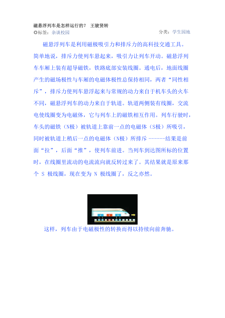 分类:学生园地磁悬浮列车是怎样运行的? 王骏贤转◎标签:杂谈校园磁悬浮列车是利用磁极吸引力和排斥力的高科技交通工具 简单地说,排斥力使列车悬起来,吸引力让列车开动磁悬浮列 车车厢上装有超导磁铁,铁路底部安装线圈通电后,地面线圈 产生的磁场极性与车厢的电磁体极性总保持相同,两者“同性相 斥”,排斥力使列车悬浮起来与常规的动力来自于机车头的火车 不同,磁悬浮列车的动力来自于轨道轨道两侧装有线圈,交流 电使线圈变为电磁体,它与列车上的磁铁相互作用列车行驶时, 车头的磁铁(N极)被轨道上靠前一点的电磁体(S极)所吸引, 同时被轨道上稍后一点的电磁体(N极)所排斥 结果是前面“拉”,后面“推”,使列车前进当列车到达图所标的位置 时,圈里流动的电流流向就反转过来了其结果就是原来那 个 S 极线圈,现在变为 N 极线圈了,反之亦然这样,列车由于电磁极性的转换而得以持续向前奔驰磁悬浮列车原理图磁悬浮列车运行时,应当与轨道始终保持10 厘米的间隙任 何的偏差对于列车的稳定性都是很危险的但磁场解决了这个问 题由于在轨道底端的磁体与车厢上的磁体是同一极性,它们之 间总有排斥力,如果因为某种原因使得列车悬浮高于 10 厘米, 也就意味着列车向轨道产生的磁场逐渐变弱的区域移去,从而它 所得到的悬浮力减少,这样列车又会回落至 10 厘米的高度。