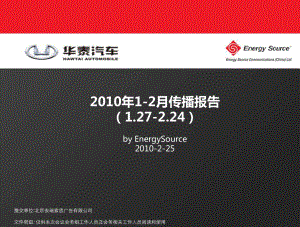 2010年1-2月传播报告(1.27-2.24)by EnergySource2010-2-25提交单位:北京安瑞索思广告有限公司文件密级:仅供本次会议会务组工作人员及会务相关工作人员阅读和使用【目录】一、综述二、日常工作报告PART 1-EPR内容营销1.新闻稿2.论坛3.本月传播亮点4.危机处理PART 2-媒体PART 3-官网四、总结和建议u综述1-2月份网络推广主要以EPR为主,传播方向由2个方向和3个热点事件构成:2个方向即品牌传播和产品传播 3大热点事件则为导演年会、B11谍照露出、09年业绩。产品传播借助导演年会、新车谍照以及2009年业绩等事件传播企业动态,提高品牌知名度。传播核心词:自主、华泰亮剑品牌传播新车B11:贴靠明星在B11上签名以及贴靠李幼斌等人获赠B11等年会细节进行持续传播。传播核心词:圣达菲传播点集中在唯一的SUV贵宾用车,突显圣达菲的产品知名度n PART1-内容营销执行项目主要内容春节前第一周(2.13-2.20)第一周(2.20-2.24)新闻稿新闻撰写新闻稿件原创编辑量62篇/新闻发布发布及被转载的网站数147篇7篇52篇发布主阵地新浪、网易、MSN、雅虎、搜狐、汽车之家、中山汽车网、新民网、车168、猫扑、空中网、宽带山等搜狐、汽车之家、中山汽车网、新民网、车168搜狐、汽车之家、车168、和讯等等论坛稿论坛稿发布论坛件发布的主阵地及转载的其他网站门户网站、垂直汽车网站、区域汽车、区域综合、社区论坛等门户网站、垂直汽车网站、社区论坛等门户网站、垂直汽车网站、社区论坛等主帖发布数量论坛稿件主帖(转载主题除外)发布到论坛的总数量141次34次94次被删除数原帖及补发贴被删除的总数量/13篇29篇热帖关注度高、精华、置顶等热门贴的数量3篇1篇7篇总点击数本周所有论坛稿件的点击总和4847619903次68046次总回复数本周所有论坛稿件的回复总和859次239次645次负面监控监控周期对竞品、网友进行的恶意、蓄意负面信息定期监控周期2次/日2次/日2次/日u话题方向和阵地选择话题围绕B11依托欧洲技术、敢于自主创新的“B+级”中高级轿车概念深化展开网络公关传播工作产品层面强调 高性能SUV领域、华泰圣达菲是一款集“黄金动力、经济节能、绿色环保”于一身的经典车型等关键词 在传播上,集中在门户类和汽车垂直类网站发稿力度执行项目主要内容月报新闻稿新闻撰写新闻稿件原创编辑量8篇新闻发布发布及被转载的网站数206篇次发布主阵地新浪、网易、MSN、雅虎、搜狐、汽车之家、中山汽车网、新民网、车168、猫扑、空中网、宽带山等论坛稿论坛稿发布论坛件发布的主阵地及转载的其他网站门户网站、垂直汽车网站、区域汽车、区域综合、社区论坛等主帖发布数量论坛稿件主帖(转载主题除外)发布到论坛的总数量269篇次被删除数原帖及补发贴被删除的总数量42篇热帖关注度高、精华、置顶等热门贴的数量11篇总点击数本周所有论坛稿件的点击总和136425次总回复数本周所有论坛稿件的回复总和1743次负面监控监控周期对竞品、网友进行的恶意、蓄意负面信息定期监控周期2次/日uEPR项目数据统计累计到2月24日,新闻稿完成206篇次,原创稿8篇,论坛层面的稿件,269篇次,总点击达到136425次,总回复数达到1743次。由于春节期间放假,下月将增加媒体发布力度!u日常工作报告-【新闻稿】网站类别媒体阵地门户新浪、网易、MSN、雅虎汽车垂直易车网、汽车探索、网上车市、车168、新民汽车区域汽车选车网、车讯网、闽西汽车网、大泉州汽车网、云南车网、展现汽车、汽车时尚、51汽车网区域综合21CN、南方网、上海热线、四川在线娱乐综合猫扑、空中网、宽带山其它类中国政府采购网、中国广播网、新意在线、中金在线新闻稿发布数量及阵地列表 原创发布稿件 8 篇,传播媒体及媒体转载206篇,发布稿件内容以2009年华泰销量创新高华泰轿车“亮剑”李幼斌成B11首位车主等话题方向为核心新闻稿提供相关网站各编辑进行发布;主要推荐位置为SINA、SOHU、汽车之家、CHE168等网站企业新闻等位置1月27日华泰轿车实车谍照曝光 北京车展亮相1月29日名导明星齐助阵 首届华泰汽车欢乐汇开幕在即2月1日助力首届导演年会 华泰汽车成最亮明星2月8日2009年华泰销量创新高2月13日华泰自主品牌“亮剑”李幼斌成B11首位车主华泰汽车联袂导演明星阵营 康洪雷幸得华泰【新闻稿件目录1.27-2.22】网站类别媒体征地门户网论坛新浪华泰汽车、搜狐圣达菲车友会、网易华泰现代、网易娱乐贴图、TOM车迷互动、雅虎论坛车友闲聊、雅虎论坛好图快享、雅虎娱乐空间汽车垂直论坛汽车之家圣达菲论坛、华泰易车会、车神榜汽车杂谈、中国汽车交易网圣达菲论坛、中国汽车交易网华泰汽车、车天下华泰汽车、车天下天下汽车论坛、网上车市圣达菲俱乐部、网上车市娱乐先锋、网上车市大话车事、车168圣达菲、中国汽车技术论坛其它民族品牌 等区域网论坛广州车友会酷车趣、YOKA爱车一族、YOKA贴图乐园、京华论坛八卦娱乐、温州汽车论坛闲情灌水、魔卡汽车车坛杂谈、名车论坛车影生活、大嘴车坛 车与生活、大嘴车坛主题图片、等娱乐综合论坛腾讯娱乐八卦、西祠爱车一族、chinaren 闲聊区、凤凰网酷车佳丽、凤凰网圣达菲车友会、21cn 人来车往、论坛稿稿发布数量及阵地列表 新浪、搜狐、网上车市等垂直类媒体论坛为重心,做线上品牌引导的宣传工作 同时为了配合宣传,我