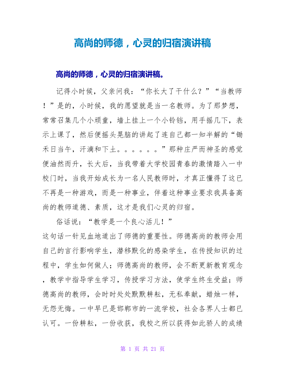 高尚的师德,心灵的归宿演讲稿高尚的师德,心灵的归宿演讲稿记得小时候,父亲问我:“你长大了干什么?”“当教师!”是的,小时候,我的愿望就是当一名教师为了那梦想,常常召集几个小顽童,墙上挂上一个小铃铛,用手摇几下,表示上课了,然后便摇头晃脑的讲起了连自己都一知半解的“锄禾日当午,汗滴和下土那种庄严而神圣的感觉便油然而升,长大后,当我带着大学校园青春的激情踏入一中校门时,当我开始成长为一名人民教师时,才真正懂得了这已不再是一种游戏,而是一种事业,伴着这种事业要求我具备高尚的教师道德、素质,这才是我们心灵的归宿 俗话说:“教学是一个良心活儿!” 这句话一针见血地道出了师德的重要性师德高尚的教师会用自己的言行影响学生,潜移默化的感染学生,在传授知识的过程中,学生如何做人;师德高尚的教师,会不断更新教育观念,教学中指导学生学习,传授学习方法,使学生终生受益;师德高尚的教师,会时时处处默默耕耘,无私奉献,蜡烛一样,无怨无悔一中早已是邯郸市的一流学校,社会各界人士都已认可一份耕耘,一份收获,我校之所以获得如此骄人的成绩,那是因为我们有一支过硬的领导班子,更离不开教师们辛勤的付出我们随处可以看到,我们学校的教师无时无刻不在起着示范作用,以他们执着的精神、渊博的知识,丰富的教学经历为一中发挥着光和热。
