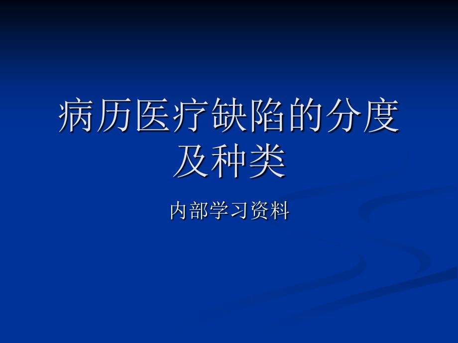 病历医疗缺陷的分度及种类 内部学习资料分度标准 临床病历的医疗缺陷根据其对患者形成的负面影响,可分为重、中、轻三度n n1、重度:n n2、中度:n n3、轻度:分度标准 n n重度 严重影响到疗效,直接导致患者重要组织器官损伤,器官功能障碍,甚至直接导致病人残废、死亡的严重后果;或违反医疗卫生法律法规、部门规章、诊疗常规造成严重后果者分度标准n n中度 影响及时诊断或治疗,延长疗程者;或违反医疗操作规程,导致患者组织器官功能的可愈性损伤,增加患者痛苦的不良后果;或者遗漏重要医疗记录,存在潜在的医疗安全或医疗纠纷隐患者分度标准n n轻度:虽存在医疗缺陷,但对患者不造成负面影响;或仅增加患者轻微痛苦,但不遗留不良后果者种类及分度判定标准临床病例(案)的医疗缺陷包括:n n病历书写n n诊断n n治疗n n手术与麻醉n n抢救n n护理n n其他方面的缺陷病历缺陷病历缺陷 病历缺陷分级n n1、重度:n n2、中度:n n3、轻度:病历缺陷(重度)病历缺陷(重度)n n1 1、病史、体格检查、病程记录错误或遗漏重要记述,直、病史、体格检查、病程记录错误或遗漏重要记述,直接导致误诊或误治,或延误抢救造成重度后果者。