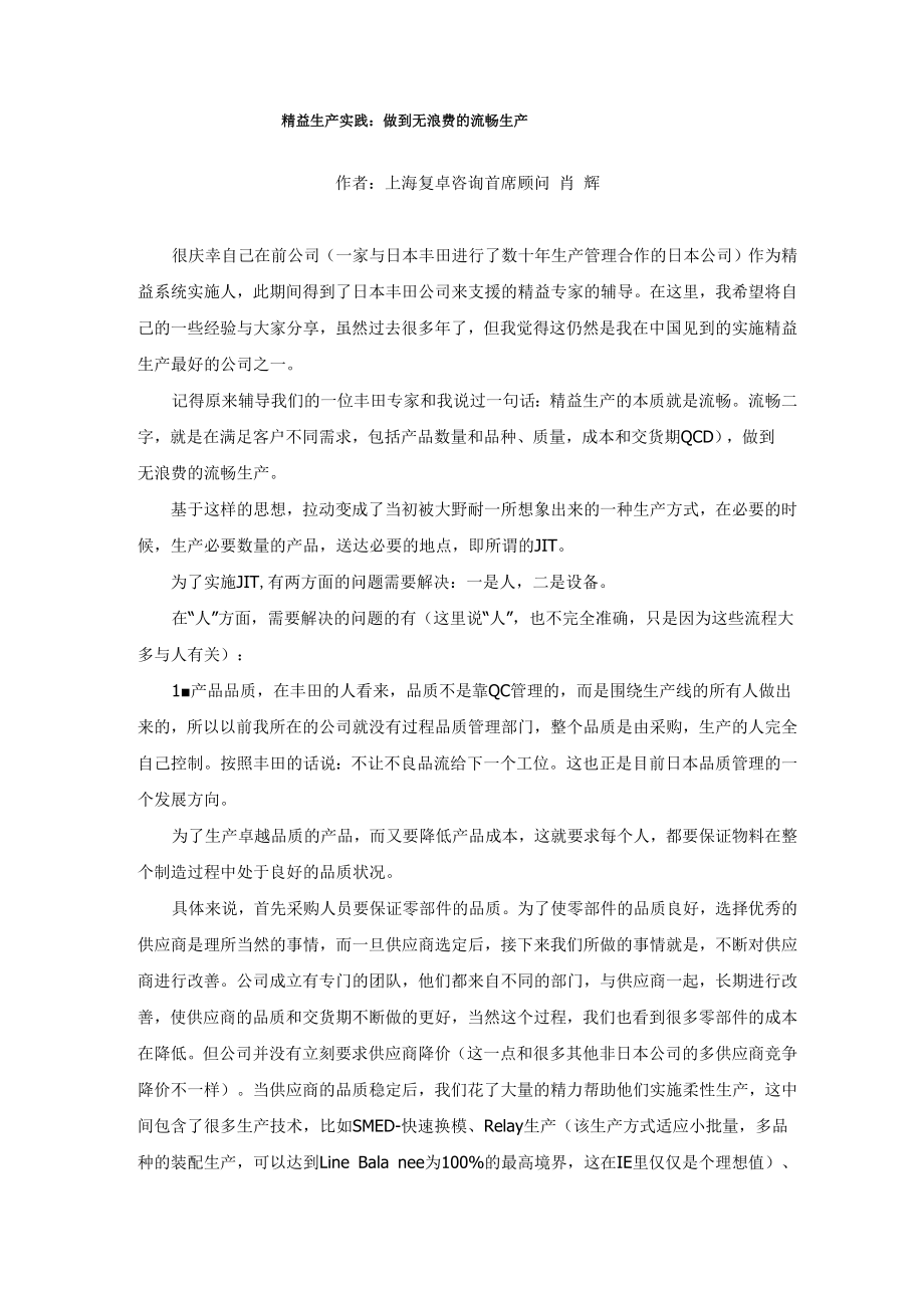 精益生产实践:做到无浪费的流畅生产作者:上海复卓咨询首席顾问 肖 辉很庆幸自己在前公司(一家与日本丰田进行了数十年生产管理合作的日本公司)作为精 益系统实施人,此期间得到了日本丰田公司来支援的精益专家的在这里,我希望将自 己的一些经验与大家分享,虽然过去很多年了,但我觉得这仍然是我在中国见到的实施精益 生产最好的公司之一记得原来我们的一位丰田专家和我说过一句话:精益生产的本质就是流畅流畅二 字,就是在满足客户不同需求,包括产品数量和品种、质量,成本和交货期QCD),做到 无浪费的流畅生产基于这样的思想,拉动变成了当初被大野耐一所想象出来的一种生产方式,在必要的时候,生产必要数量的产品,送达必要的地点,即所谓的JIT为了实施JIT,有两方面的问题需要解决:一是人,二是设备在“人”方面,需要解决的问题的有(这里说“人”,也不完全准确,只是因为这些流程大 多与人有关):1■产品品质,在丰田的人看来,品质不是靠QC管理的,而是围绕生产线的所有人做出 来的,所以以前我所在的公司就没有过程品质管理部门,整个品质是由采购,生产的人完全 自己控制按照丰田的话说:不让不良品流给下一个工位这也正是目前日本品质管理的一 个发展方向。