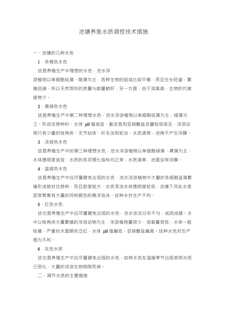 池塘养鱼水质调控技术措施一、池塘的几种水色1 1茶褐色水色这是养殖生产中理想的水色,池水浮游植物以单细胞硅藻、隐藻为主,各种生物的组成比较平衡,而且生长旺盛,繁殖迅速,所以天然饵料的质量与数量都好,另一方面,由于溶氧高,生物的代谢废物少2 2黄绿色水色这是养殖生产中第二种理想水色,池水浮游植物以单细胞硅藻为主,绿藻次之形成优势种时,水体 pHpH 值适宜,氨态氮和亚硝酸盐含量较低或无,浮游动物只有少量的枝角类、无节幼体、纤毛虫和轮虫,水质清爽,池角不产生浮膜3 3淡绿色水色这是养殖生产中的第三种理想水色,池水浮游植物以单细胞绿藻、裸藻为主,水体透明度适宜,水质的各项理化指标均正常,水质清爽,池面没有浮膜4 4蓝绿色水色这是养殖生产中应尽量避免出现的水色,池水浮游植物中大量的多细胞蓝藻繁殖形成绝对优势种,而且密度较大,水质浑浊水体透明度较低,池塘下风处水表层常聚集有大量的同样颜色的悬浮泡沫这种水对生产不利5 5红色水色这也是养殖生产中应尽量避免出现的水色,池水浓淡分布不匀,成团成缕水中以枝角类大量繁殖的浮游动物为主,浮游植物量很少,溶氧量很低,水体一般较瘦,严重时水面颜色泛红,水体 pHpH 值偏低,亚硝酸盐偏高。