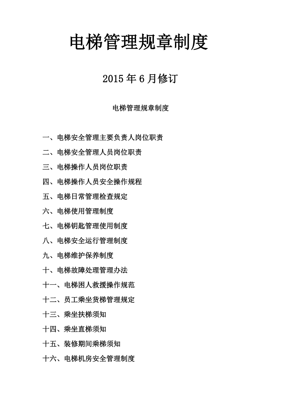 电梯管理规章制度2015年6月修订电梯管理规章制度一、 电梯安全管理主要负责人岗位职责二、 电梯安全管理人员岗位职责三、 电梯操作人员岗位职责 四、 电梯操作人员安全操作规程五、 电梯日常管理检查规定六、 电梯使用管理制度七、 电梯钥匙管理使用制度八、 电梯安全运行管理制度九、 电梯维护保养制度十、 电梯故障处理管理办法十一、 电梯困人救援操作规范十二、 员工乘坐货梯管理规定十三、 乘坐扶梯须知十四、 乘坐直梯须知十五、 装修期间乘梯须知十六、 电梯机房安全管理制度十七、 电梯安全管理和操作人员培训考核制度十八、 电梯定期检验制度十九、 技术档案管理制度二十、 电梯设备设施巡视检查记录表电梯安全管理主要负责人岗位职责1、 全面管理单位电梯安全运行管理和节能工作,建立健全电梯管理各项规章制度2、 保证本单位电梯安全、节能必要的资源投入3、 确定电梯安全管理人员和电梯日常维护保养人员4、 配合做好每年一次的电梯年检工作和各项检查考核工作5、 确定意外事件和事故的紧急救援小组成员,并报单位领导批准,成员应包括一名单位的行政领导6、 拟定演习内容、时间、排险方法、急救预案并申报行政领导批准,每年至少组织一次应急演习,成员都必须参加。