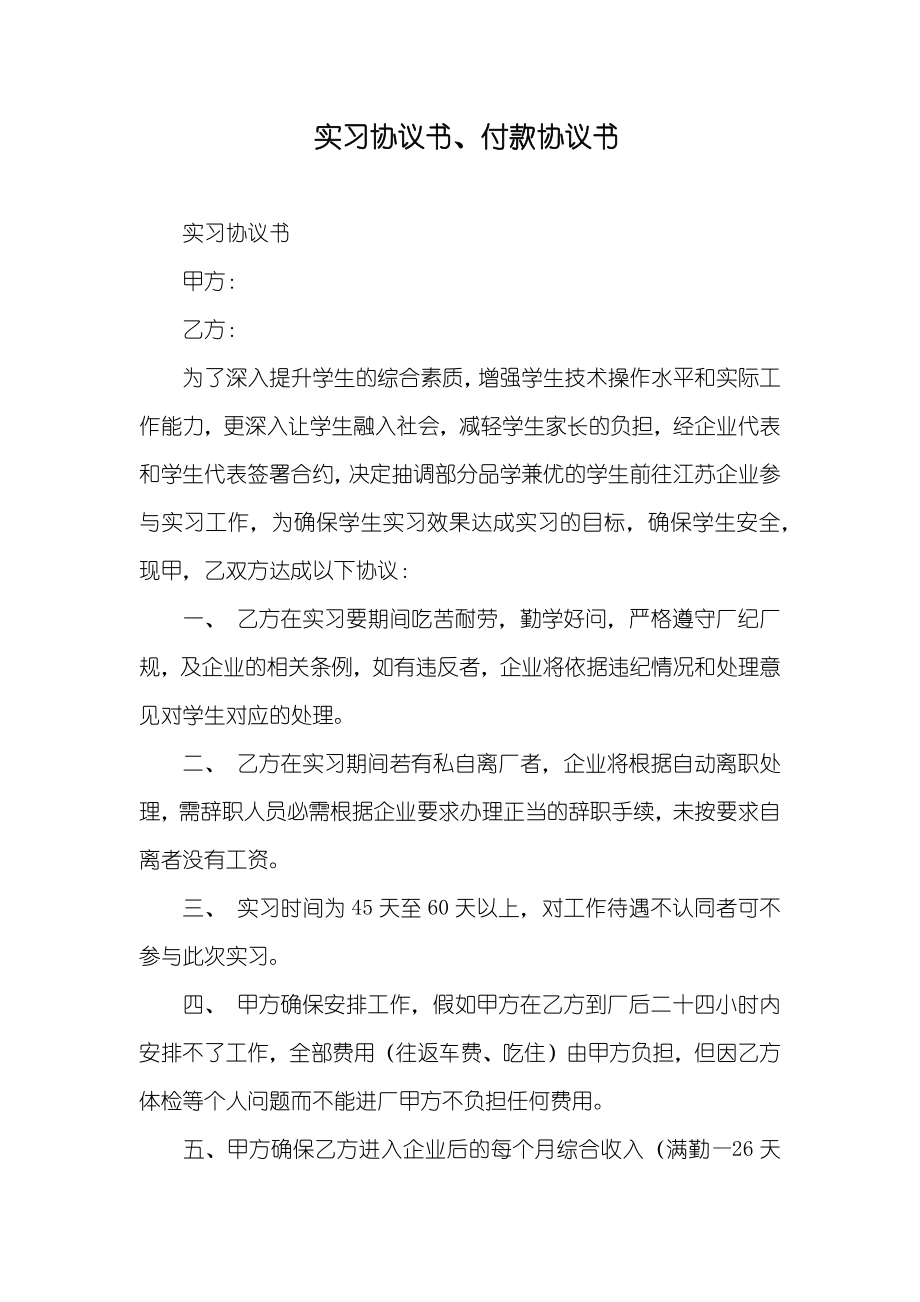 实习协议书、付款协议书 实习协议书 甲方: 乙方: 为了深入提升学生的综合素质,增强学生技术操作水平和实际工作能力,更深入让学生融入社会,减轻学生家长的负担,经企业代表和学生代表签署合约,决定抽调部分品学兼优的学生前往江苏企业参与实习工作,为确保学生实习效果达成实习的目标,确保学生安全,现甲,乙双方达成以下协议: 一、 乙方在实习要期间吃苦耐劳,勤学好问,严格遵守厂纪厂规,及企业的相关条例,如有违反者,企业将依据违纪情况和处理意见对学生对应的处理 二、 乙方在实习期间若有私自离厂者,企业将根据自动离职处理,需辞职人员必需根据企业要求办理正当的辞职手续,未按要求自离者没有工资 三、 实习时间为45天至60天以上,对工作待遇不认同者可不参与此次实习 四、 甲方确保安排工作,假如甲方在乙方到厂后二十四小时内安排不了工作,全部费用(往返车费、吃住)由甲方负担,但因乙方体检等个人问题而不能进厂甲方不负担任何费用 五、甲方确保乙方进入企业后的每个月综合收入(满勤—26天及以上)在2300—3000之间 六、乙方在工作期间、工作场所,因发生意外伤害(工伤)一切费用由企业负担,但如学生本身违反操作规程造成的伤害或身体有病和原发性疾病发作等工伤以外疾病造成的伤害,由学生自行负责。
