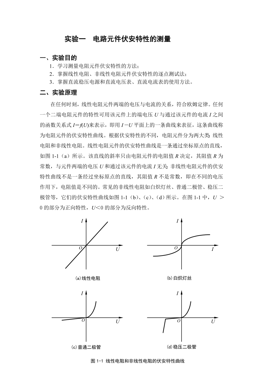 实验一 电路元件伏安特性的测量一、实验目的1.学习测量电阻元件伏安特性的方法;2.掌握线性电阻、非线性电阻元件伏安特性的逐点测试法;3.掌握直流稳压电源和直流电压表、直流电流表的使用方法二、实验原理在任何时刻,线性电阻元件两端的电压与电流的关系,符合欧姆定律任何一个二端电阻元件的特性可用该元件上的端电压U与通过该元件的电流I之间的函数关系式I=f(U)来表示,即用I-U平面上的一条曲线来表征,这条曲线称为电阻元件的伏安特性曲线根据伏安特性的不同,电阻元件分为两大类:线性电阻和非线性电阻线性电阻元件的伏安特性曲线是一条通过坐标原点的直线,如图1-1(a)所示该直线的斜率只由电阻元件的电阻值R决定,其阻值R为常数,与元件两端的电压U和通过该元件的电流I无关;非线性电阻元件的伏安特性曲线不是一条经过坐标原点的直线,其阻值R不是常数,即在不同的电压作用下,电阻值是不同的常见的非线性电阻如白炽灯丝、普通二极管、稳压二极管等,它们的伏安特性曲线如图1-1(b)、(c)、(d)所示在图1-1中,U >0的部分为正向特性,U<0的部分为反向特性a)线性电阻(b)白炽灯丝(c)普通二极管(d)稳压二极管图1-1 线性电阻和非线性电阻的伏安特性曲线绘制伏安特性曲线通常采用逐点测试法,电阻元件在不同的端电压U作用下,测量出相应的电流I,然后逐点绘制出伏安特性曲线I=f(U),根据伏安特性曲线便可计算出电阻元件的阻值。