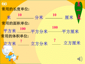 米米 1010分米分米 厘米厘米 平方米平方米 平方分米平方分米 平方厘米平方厘米 立方米立方米 立方分米立方分米 立方厘米立方厘米?100100常用的长度单位常用的长度单位:常用的面积单位常用的面积单位:常用的体积单位常用的体积单位:复一复小学数学五年级下册这个正方形的面积等于多少平方分米?又等于多少平方厘米?这个正方形的面积等于多少平方分米?又等于多少平方厘米?1分米分米=()厘米)厘米问题问题1:(:()()()=()平方分米)平方分米 问题问题2:(:()()()=()平方厘米)平方厘米 101001010111体积单位间的进率体积单位间的进率1立方厘米立方厘米1立方分米立方分米1立方分米里有多少个1立方厘米呢?猜猜看1 1立方厘米立方厘米探一探1 1立方分米立方分米1 12 23 34 45 56 67 78 89 9 10101 1分米分米1 1分米分米1 1分米分米1 1立方厘米立方厘米1立方分米立方分米1000立方厘米立方厘米探一探1010101010101010体积单位间的进率体积单位间的进率棱长棱长1分米分米体积是体积是1立方分米立方分米棱长棱长10厘米厘米V=111V=10 1010体积是体积是1000立方厘米立方厘米1立方分米立方分米=1000立方厘米立方厘米=仿照上面的方法,你能推算出1m3等于多少立方分米吗?体积单位间的进率体积单位间的进率棱长棱长1米米体积是体积是1立方米立方米棱长棱长10分米分米V=1 11V=10 1010体积是体积是1000立方分米立方分米1立方米立方米=1000立方分米立方分米=体积单位间的进率体积单位间的进率 1立方分米立方分米=_立方厘米立方厘米1立方米立方米=_立方分米立方分米 从上面我们可以看出:相邻的两个体从上面我们可以看出:相邻的两个体积单位之间的进率都是积单位之间的进率都是_。1000 1000 1000 填填看 下面是长度单位、面积单位、体积单位表下面是长度单位、面积单位、体积单位表 分别填出它们相邻两个单位之间的进率。分别填出它们相邻两个单位之间的进率。单位名称单位名称相邻两个单相邻两个单位间的进率位间的进率长度长度面积面积体积体积 101001000体积单位间的进率体积单位间的进率米、分米、厘米米、分米、厘米平方米、平方分米、平方厘米平方米、平方分米、平方厘米立方米、立方分米、立方厘米立方米、立方分米、立方厘米复习3、填空:(说出是怎么想的)、填空:(说出是怎么想的)把高级单位的数化成低级单位的数要乘进率,把高级单位的数化成低级单位的数要乘进率,把低级单位的数化成高级单位的数要除以进率。把低级单位的数化成高级单位的数要除以进率。体积单位间的进率体积单位间的进率1.52.845450例例3:(:(1)3.8m3是多少立方分米?是多少立方分米?(2)2400cm3是多少立方分米是多少立方分米?1000想想:1m3=dm3 3.8m3=dm338001000想想:cm3=1dm3 2400cm3=dm32.4这个牛奶包装箱的体积是多少这个牛奶包装箱的体积是多少?503040 60000(cm3)60000cm360dm30.06m3Va b h 箱上的尺寸一般是这个箱上的尺寸一般是这个长方体的长、宽、高。长方体的长、宽、高。50cm30cm40cm绿色圃中小学教育网绿色圃中小学教育网 http:/www.L 体积单位间的进率体积单位间的进率练一练一、填空1、相邻的长度单位间的进率是();相邻的面积单位间的进率是()。2、棱长为1米的正方体的体积是();也可以把它看成是棱长为()分米的正方体,体积为()立方分米。101001m3101000 体积单位间的进率体积单位间的进率练一练二、在括号里填上适当的数。5480007403.55005050000体积单位间的进率体积单位间的进率练一练三、比较大小。1m3 1000dm3 0.125m3 125cm3 13m3 1300cm3 65cm3 56dm3 =体积单位间的进率体积单位间的进率练一练四、判断。1、在我们学过的所有单位中,体积单位最大,长度单位最小。()2、棱长为10厘米的正方体,体积为1立方分米。()体积单位间的进率体积单位间的进率练一练五、应用 一堆砖摆成长方体形状,长3米,高25分米,宽18分米,如果每立方米有500块砖,这堆砖共有多少块?3 2.5 1.8 =13.5(m3)13.5 500=6750(块)(块)答:这堆砖共有答:这堆砖共有6750块。块。体积单位间的进率体积单位间的进率